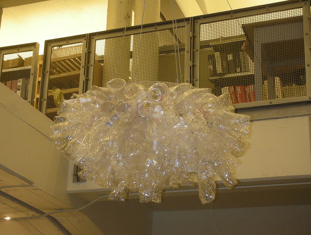 Once I had the material and the general idea, it wasn’t hard to develop a rough design; I had the idea to arrange the bottles into rings and then stack the rings on top of each other to create the fixture. I wasn’t particularly inspired by any individual designs I found, but in my research I found the following plastic bottle designs to be inspiring.