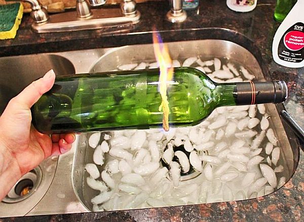The progress for the upcycle project is going well. I have collected all of my needed wine bottles (plus quite a few extra) and have already begun trying to score the bottles with the glass cutter. If this technique doesn’t work, I have also seen videos of people dipping a length of twine in acetone, wrapping it around the bottle and setting it on fire. After the fire has burned out, you quickly put the bottle into some ice water which causes a fracture at the desired area. A photo of this technique is shown below: