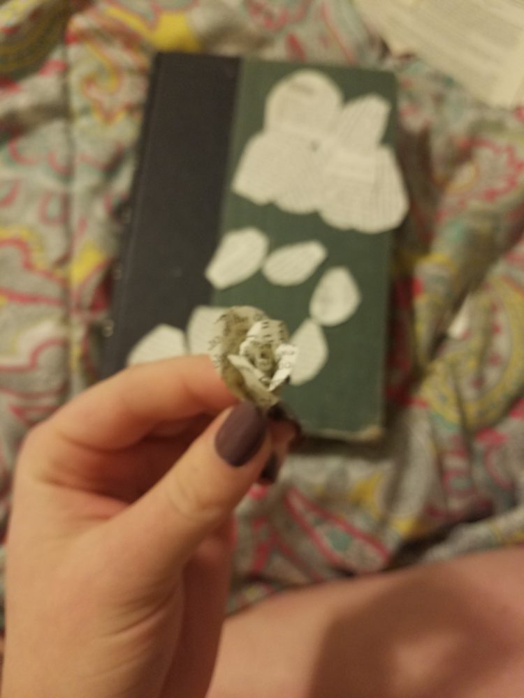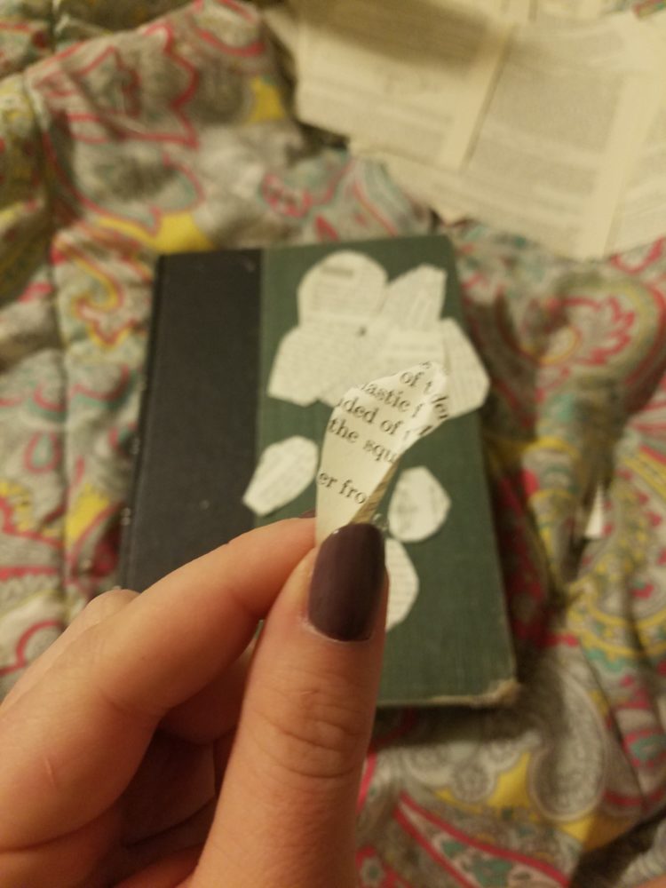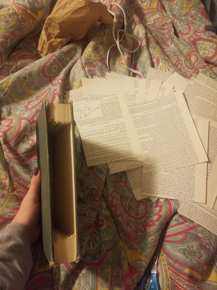 I began by considering what in the world I could do with this old book. Immediately, I wanted to hollow it out and use it as a purse, wallet, jewelry box, or secret compartment. However, I didn’t feel that simply hollowing it out and using it as any of those things would really do the aesthetic justice, nor the idea of upcycling. So I decided to use the pages that I cut out as a decoration or functional part or something. Maybe I could weave them into a strap and attach it to the cover like a purse? Maybe I could use them for paper mache? And then it hit me: roses! So I got started.