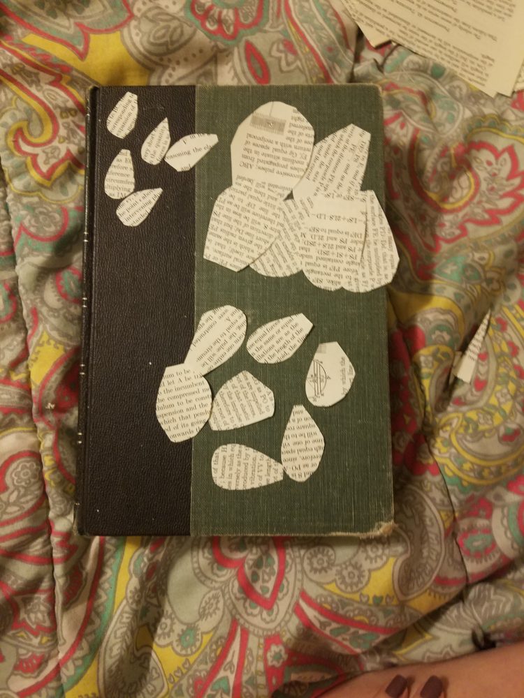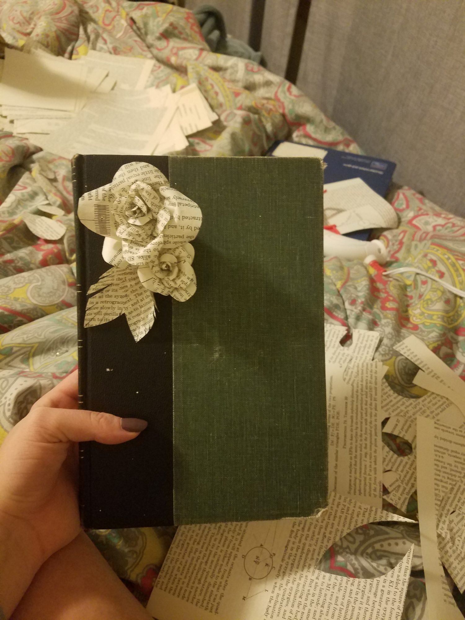 I like the chosen aesthetic, as well as the flowers you made from the old pages and put on the front, they’re really well done. The choice of book also enforces the vintage aesthetic. I can see someone hiding like a small revolver in there. Perfect use of a physics book honestly.
