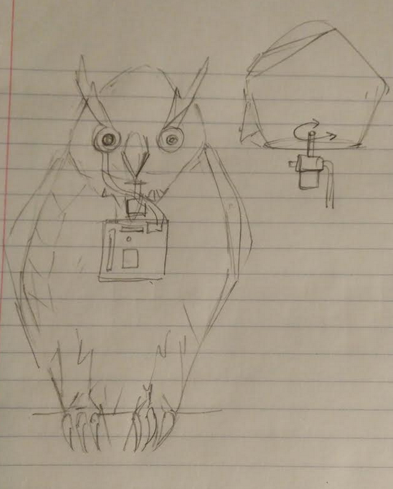 I’ve had a few more ideas conceptually since the last post regarding the initial inspirations; To incorporate the dynamic component of the project, I think I will end up using a servo or motor to represent simple motion over time somewhere on the sculpture. Vaguely, I was thinking either a moving body part (via simple lateral or rotational movement) or something more complex like shifting or morphing of the frame itself. The surreal aesthetic will be conveyed through the form, while the materials will help lend itself to the contemporary aesthetic. More specifically, I think that using motion (and the parts to achieve such motion) help to convey meaning within the sculpture. Specifically, the idea moving forward so far is an owl sculpture which moves its head to follow things moving past. Here’s a rudimentary sketch of that idea: