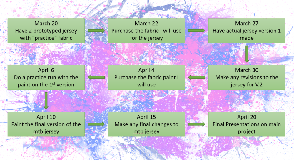 For the final version, I will either use some sort of Dri-Fit polyester wicking fabric, purchased from The Fabric Fairy (fabricfairy.com), or a summer wool blend purchased from local Boulder shop, Elfriede’s Fine Fabrics. I will take into consideration which fabric will do better with the fabric paint and price. Wool can be range from $32 to $60 per yard, while the dri-fit wicking fabric is around $10 to $15 per yard.