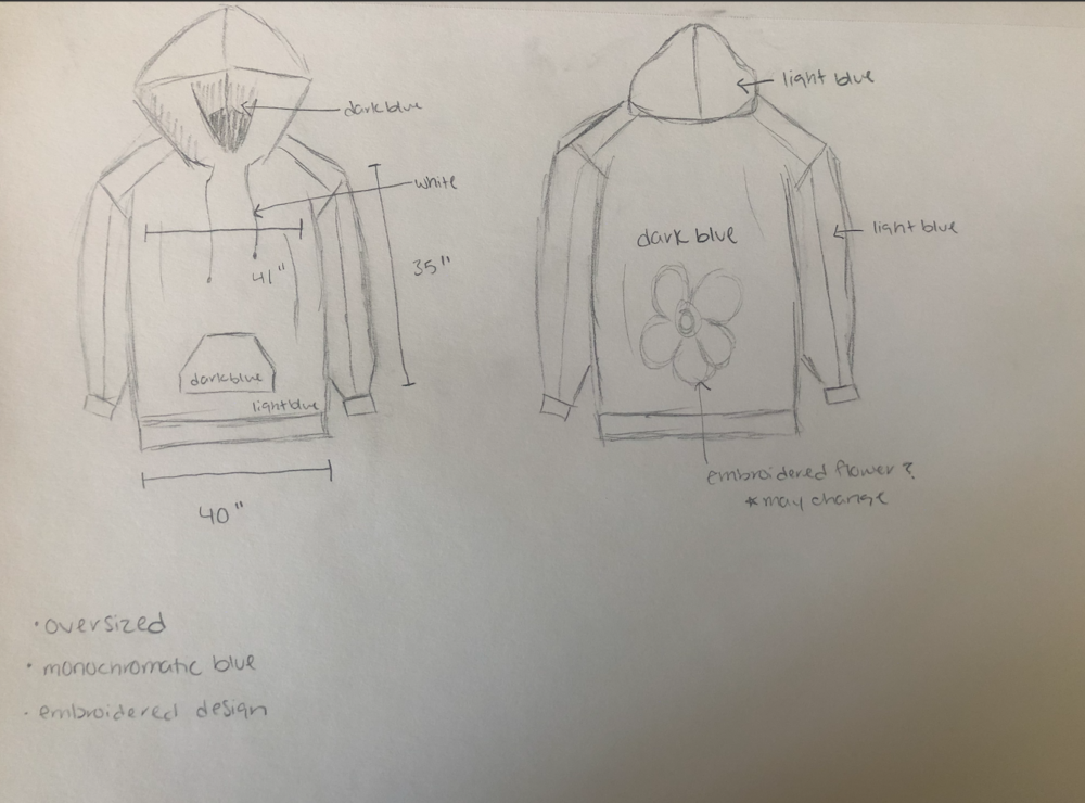 I have drawn the design for what I’m hoping my final product to look like, sketching how I would imagine my sweatshirt will be. There will be different panels of different blue tones, and hopefully an embroidered design in the back!