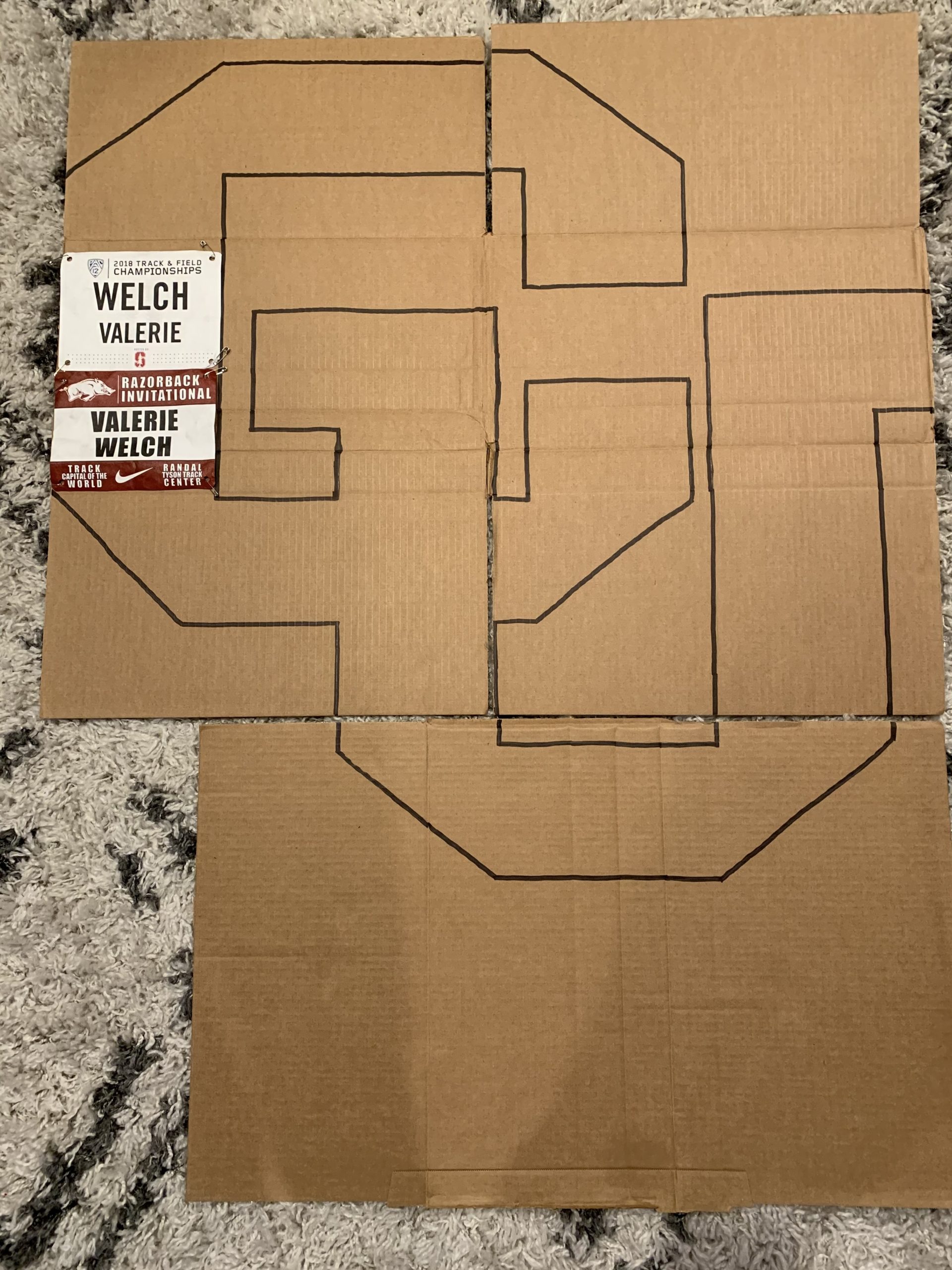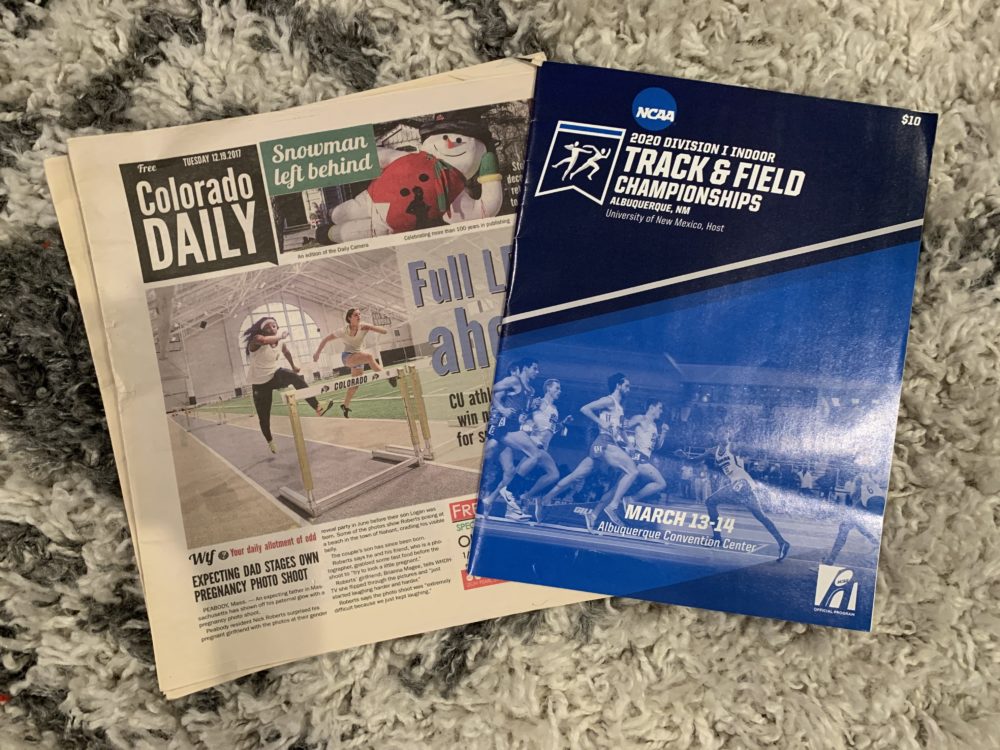 I have gathered all of the supplies for my project and have created the layout that I want my racing bibs to be in. The two images below show my racing bibs in the layout of the CU logo and the other materials I have to fill in the blanks. One is a newspaper article from my freshman year of college (I have 2 copies, don’t worry) and the other is the meet schedule for the 2020 NCAA D1 Indoor Championship meet that I attended last March. I was originally going to use both my high school and college memorabilia but decided to use just the things I had obtained from collegiate track and field instead. This is because the logo is for CU and really the two experiences are completely different. My college career deserves its own artwork.