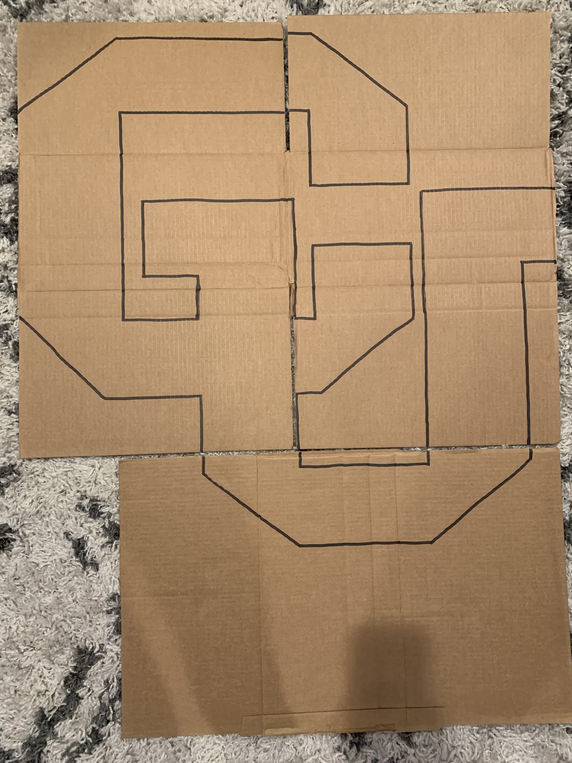 I then used the CU logo to draw out a large version of it on to an old cardboard box (shown below). I haven’t decided if this will be the final material that all of the bibs will be mounted on but I at least have a stencil/outline of the final design. I am also considering wood or particle board, but I think it may be hard to find a piece large enough. Another thing I have yet to decide on is the type of adhesive I will use. I think a clear coat on top could be nice to hold everything together and give it a nice smooth finish, but perhaps just gluing the back side and leaving the fronts of the bibs exposed could add to the old school athletics aesthetic that I was originally trying to replicate.