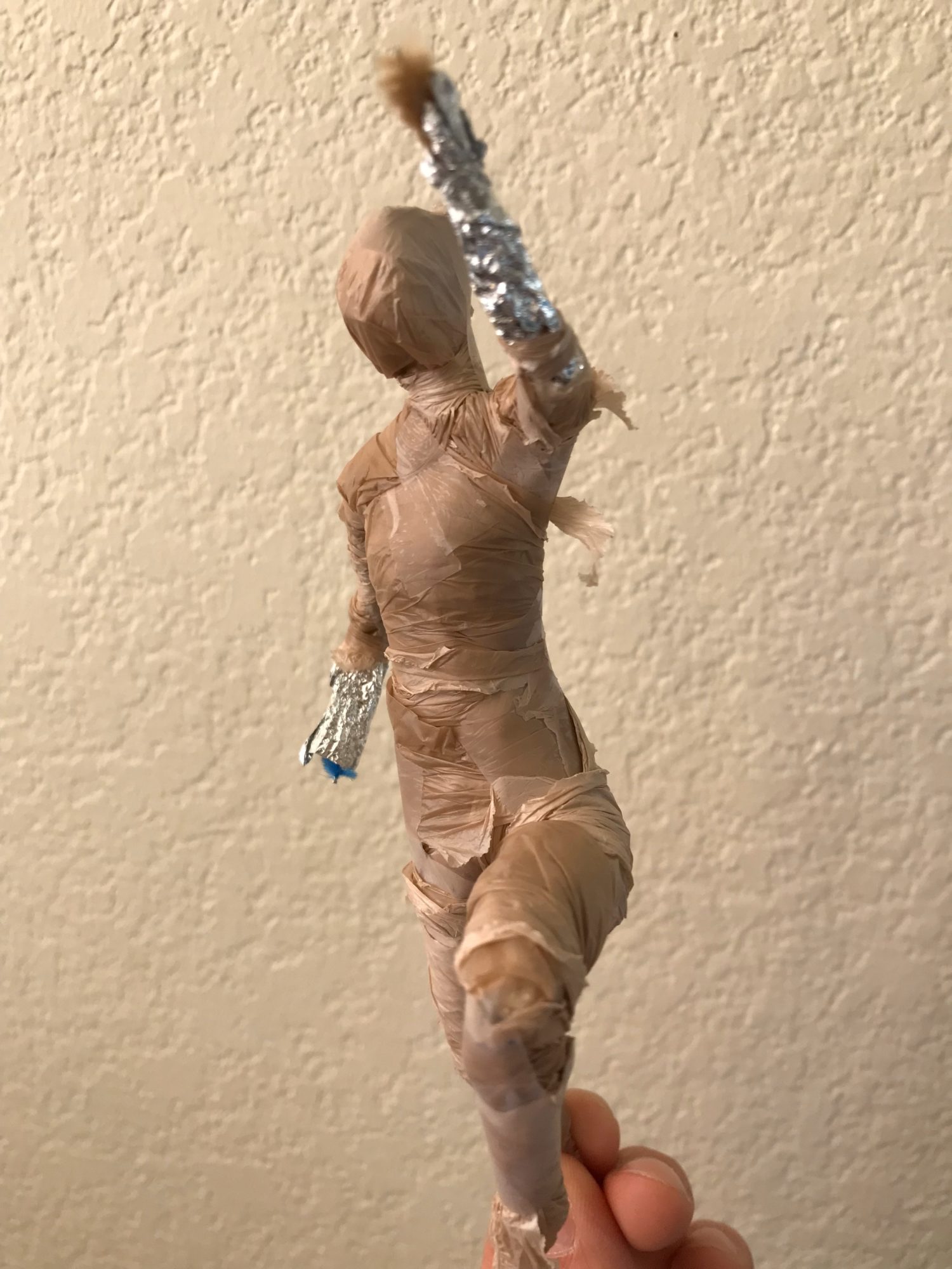 Daedalus, this is amazing! You really captured the representation of motion with the skeleton’s pose, the pipe cleaners were a great idea as a rigid structural support. The foil gave you a great opportunity to capture the figure’s body shape and you achieved it. Finally, the plastic bags give this figure ragged clothing or even a tunic/robe aspect. The creases in the plastic make this figure look very much like it’s wearing real clothes. Are you thinking about painting it? What more will you do to it?