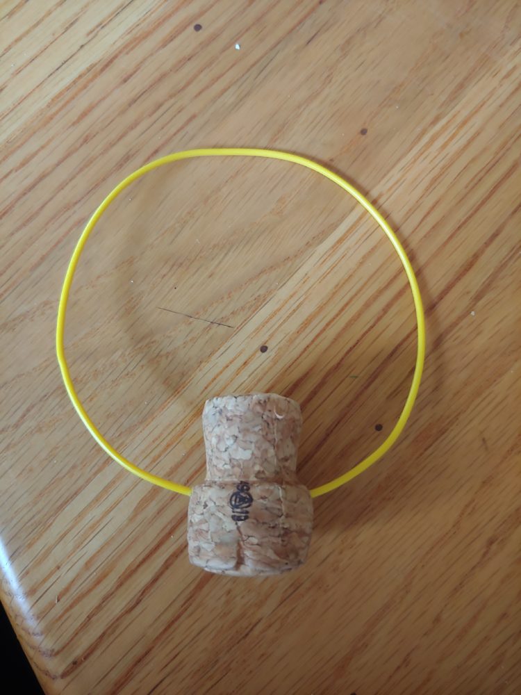 The most complex design one used wire, a wine cork cut in half, one cork with a hole in it, two magnets, and green and gold paint. I first shaped the wire into a circle with the open ends fitting on opposite sides of the wine cork with a whole in it. I then attached the wire ends to each side of the cork respectively using a tiny amount of gorilla glue. To get half of a wine cork you first steam the cork for a few minutes without the water touching the cork to ensure that the cork won’t crumble. Once done steaming take the cork out and cut in half. I then used gorilla glue to again attach a magnet to the cut in half cork and the cork with the hole in it. The yellow wire circle was then painted the gold color to tie in the same theme, and green was added to the cut wine cork to add contrast.
