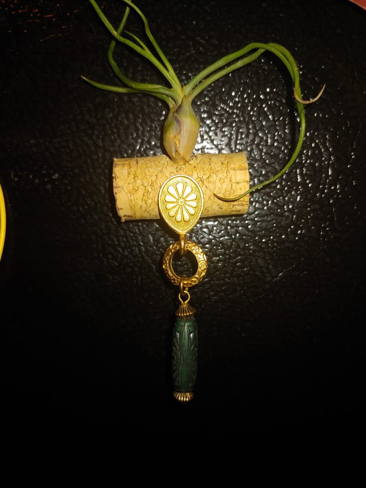 In total I designed 3 different type of magnet styles. One of the least complex designs I made used a wine cork with a hole, a magnet, and a piece of old jewelry. The jewelry chosen was used because of its simple yet elegant shape as well as the nice coloring. This particular piece is what is known as a post earing, so on the back is a small sharp post that can be poked into the cork. For this magnet I decided to make the wine cork be horizontal and then poked the earing post into the center so that it creates a T-shape with the cork as shown below. Gorilla glue was then used to attach the magnet to the cork side without the earing.