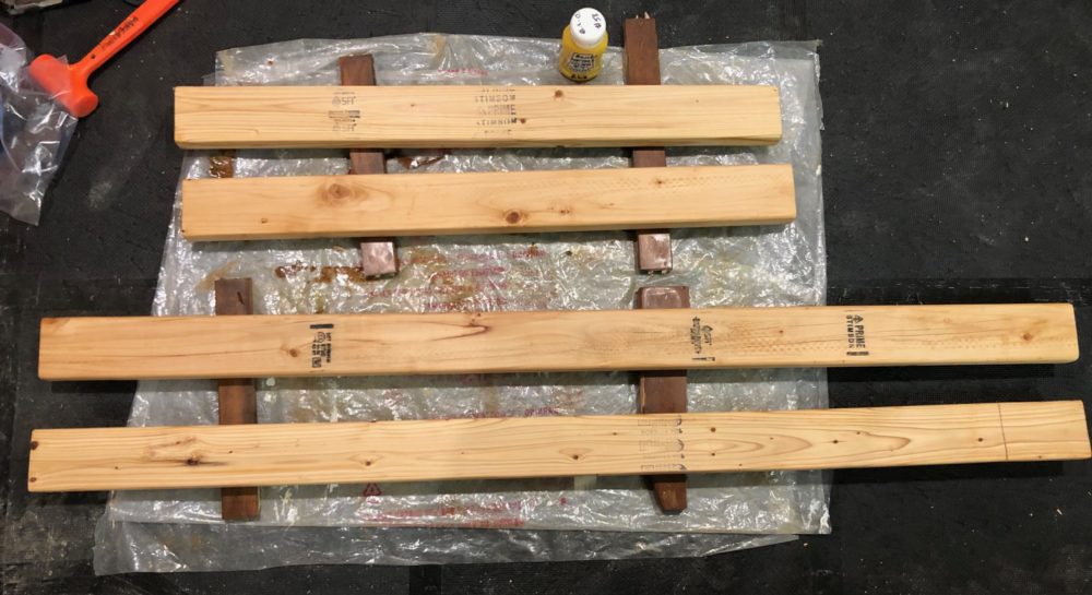 Next, I cut the two 8’ pine boards down to two 5’ and two 3’ boards. I then carefully sanded all of my raw wood materials until they were smooth and ready to be stained and finished. The CU Boulder woodshop supplied my with a couple stains to choose from, but I ultimately decided to stain the boards made from the chair seats with Fruitwood oil stain and then finish them with a water-based polyurethane finish. I finished the pine boards with boiled linseed oil, which gave them a shiny, clean appearance.