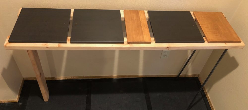 There are a few low quality features in the final design. The legs ended up being somewhat unstable, primarily on the side with the metal legs, due to a poor effort to properly affix them to the table top. The metal legs are also very greasy, leaving quite a mess on anything they touch. Additionally, the boards I got from Arc Thriftstore were originally from IKEA, so the material quality is fairly poor. While these boards look nice in the design, using real wood for those portions of the table top would have resulted in a more sturdy and higher quality table. Also, I started to make a premature cut in the wrong location on one of the pine table top support boards, leaving a cut mark that is a bit of an eye sore. I’ve chosen to have this side of the table face the wall to minimize the cut mark’s visibility.