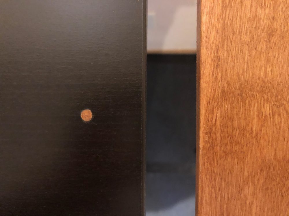 The last thing to do was add some finishing touches. Each of the three IKEA boards I got from Arc Thrisftstore had a small hole to fit a knob into for their original purpose. I decided to fill those holes with leftover material from the chair. To do this, I cut small pieces of wood with a saw and sanded them with a dremel until they were round and just small enough to be press fitted into the holes in the boards. This resulted in a nice contrast between the dark boards and the rich brown fillers. I then decided to utilize some left over pieces from the chair to make additional table leg supports. To do this, I cut four square wooden poles down to a foot in length, planed off the old finish, sanded and refinished them, then screwed them onto either side of the table legs to provide increased stability and support. After that, my table was complete.
