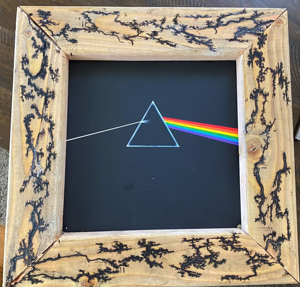 My vision for this project was simple: my overall goal was to create a very simple frame for my Dark Side of the Moon record. My functional goals were also simple: no inner length could be longer than 12.25 inches, and the frame must fit a vinyl record (12.5″ squared) on the inside. The artistic goal for this upcycle project was to achieve a unique fractal pattern that juxtaposes the unburnt wood surrounding the fractals. Below, I will detail the fabrication process as well as the materials needed.