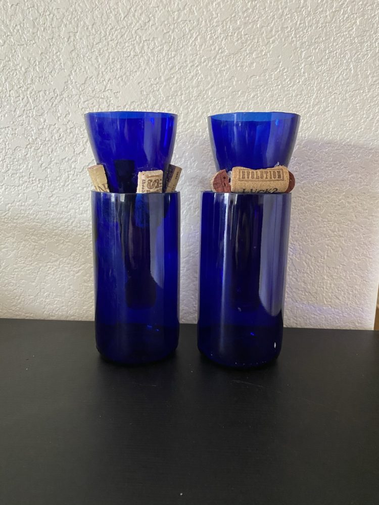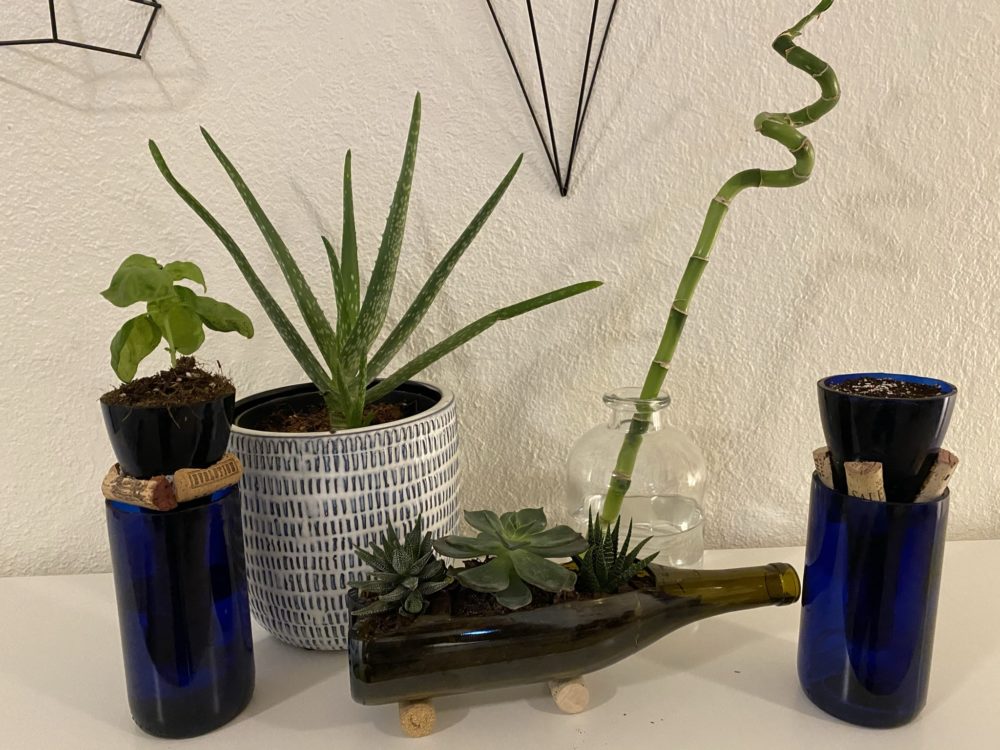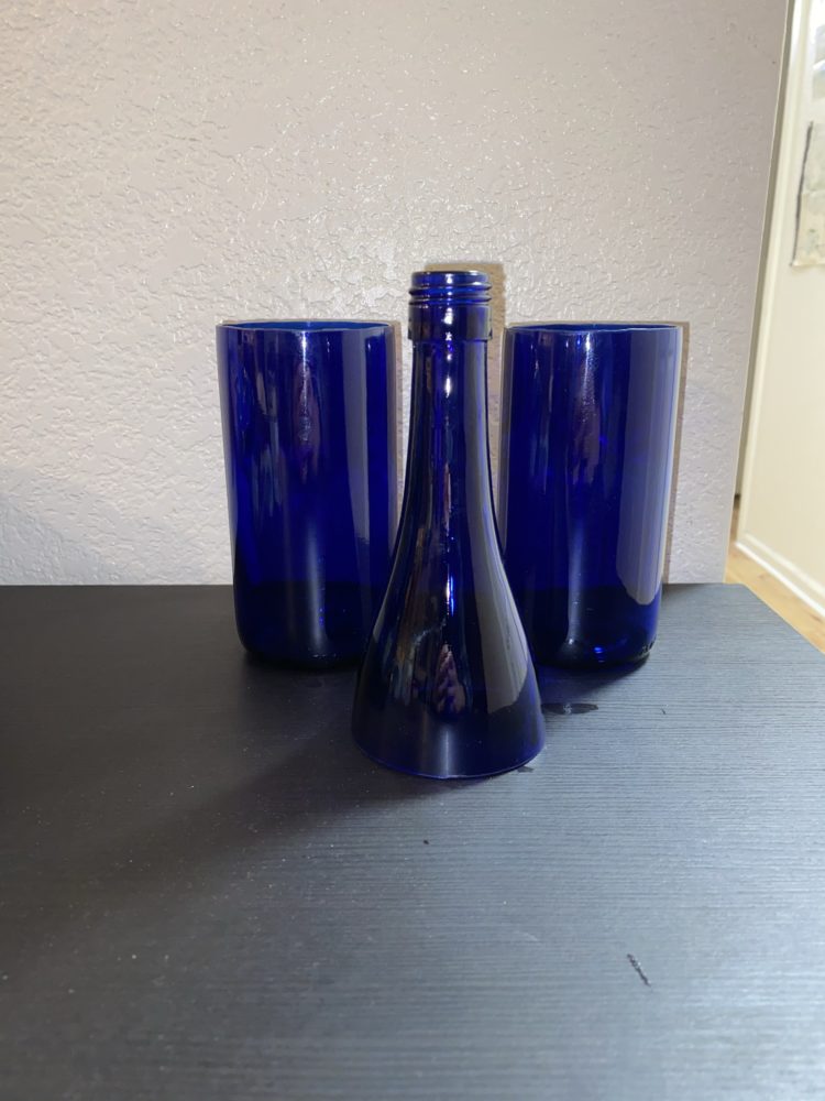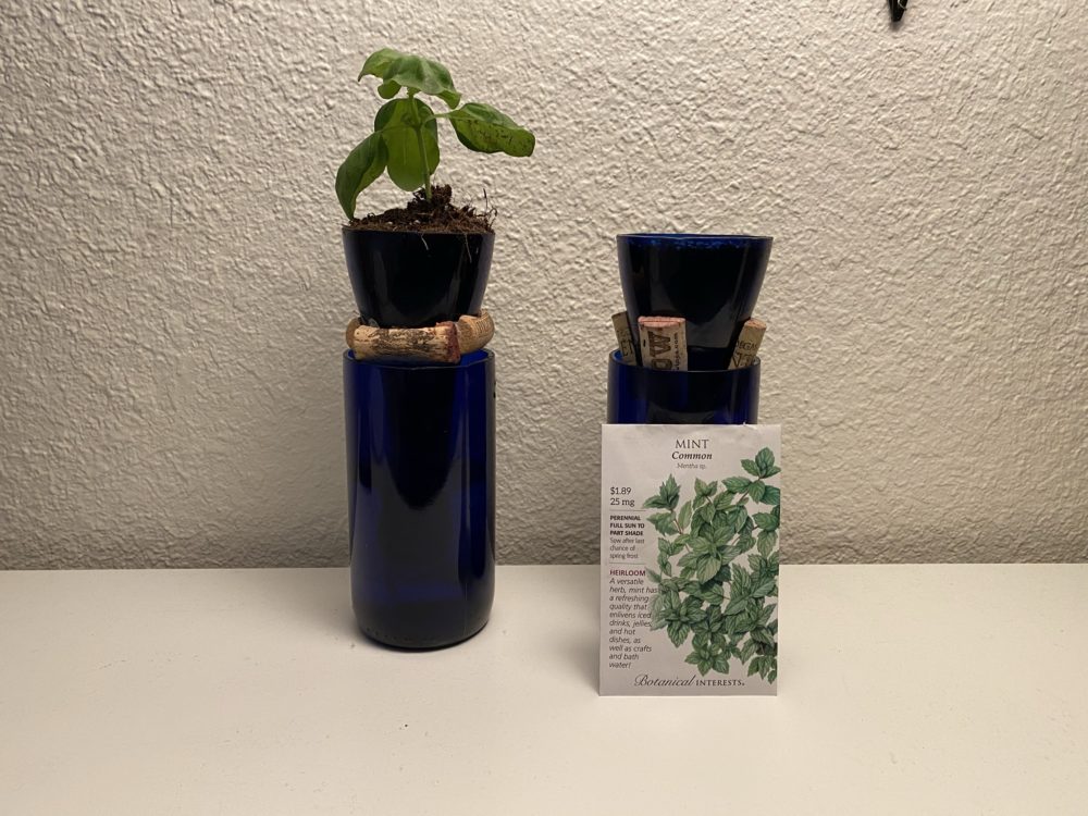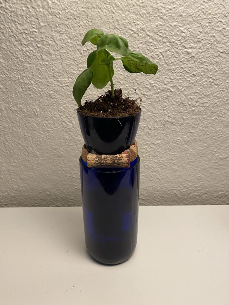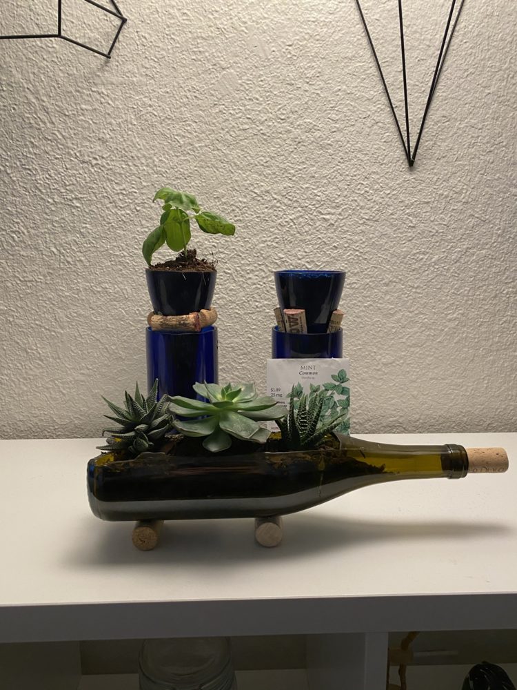 I think you did an awesome job with this Upcycle project and I think the plant holders turned out really nicely. I like what you did with the wine bottles and how you were able to score and cut the blue bottle to give it nice finish. On a different note I think the green bottle has a nice rough finish to it which gives your overall project a bit of a different feel. Both a smooth and a rough finish that serve the same purpose. As the semester progresses I will be curious to see if these self watering plants are able to be preserved and how they will grow in the coming months. Overall, I think you did a great job with this project and presented some unique artifacts!