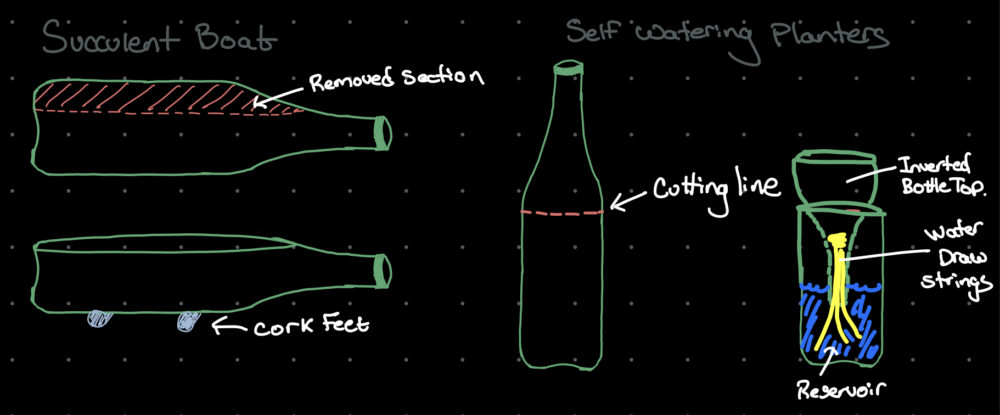 For my upcycle project I decided to take three used wine bottles and upcycle them into planters for some fresh new home greenery. My inspiration truthfully came from my parents. For as long as I can remember they have kept the house full of flowers and herbs both for decoration and for cooking. Plants bring a fresh natural aesthetic to any space, and depending on the planter they’re in, can play well with a sustainable modern aesthetic. I wanted to bring that to my college apartment, so i began scouring the internet for some ideas of how to turn my leftover wine bottles into beautiful upcycled planters. In my research I found a very cool idea for self watering planters for small herb plants, as well as for a boat type planter for succulents that I was able to modify and make my own. So what did I decide to create? Two beautiful self watering herb planters for Mint and Basil to use for cooking and mixology, and a sleek looking succulent boat to give as a gift to my girlfriend Emily. The self watering planters would be made by cutting off the tops of bottles and inverting them into their bases. Then by balling up string and dangling it into a reservoir of water located in the base, you can feed water directly into your plant’s root system. The succulent boat would be made by cutting a wine bottle lengthwise, and would be planted with some nice store bought succulents. I figured as long as the glass was smooth and the edges weren’t dangerous that my specifications would be met, so with my ideas in hand I got to work procuring materials.