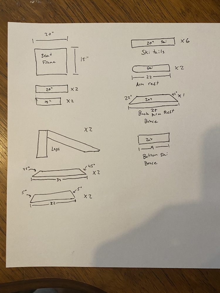 As I stated before adirondak style ski chairs are relatively complex in their pieces and as a result they end up looking very beautiful due the non organic lines of the wood cut outs. I dont have the capacity to mimic this beauty and so my plan is to simplify the design and make a chair that is more upright and less leaned in the back, hopefully this will help to reduce the stress put on the ski back, since they will be held in with only a couple wood screws.