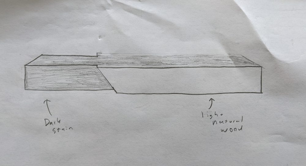 This turned out really well! The wood looked really rough at the start, but it looks like you got it sanded down really well. I think the design choice of the 45 degree angles makes the design stand out (in a good way)! I like your drawing with the dark stain to help differentiate the two sections, I think that would make a good addition. Did you think about mitering the corners? That might add a bit of complication to the process, but might be a nice look. Overall nice job, it looks great!