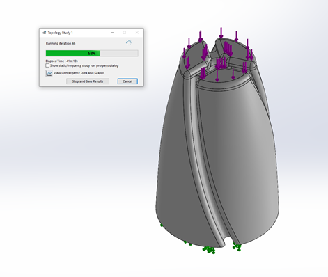 To achieve this highly unique and complex structure in my Final Project, I am using the SolidWorks tool Topology Optimization. This tool strategically takes out material that is not holding a relatively high amount of stress from an applied load. Simulations using Topology Optimization at its highest setting take multiple hours which ended up making this process take multiple days of work.