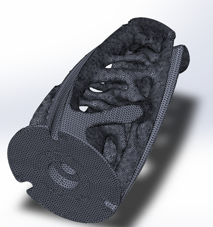 While it is often difficult to get a visually appealing output of a Topology Optimization Simulation. Balancing manufacturability and holding true to my inspirations was tricky. I managed to get it right after ten tries. The figures below show off the crazy organic structure: