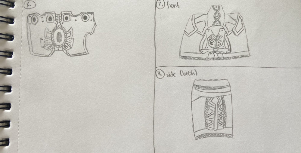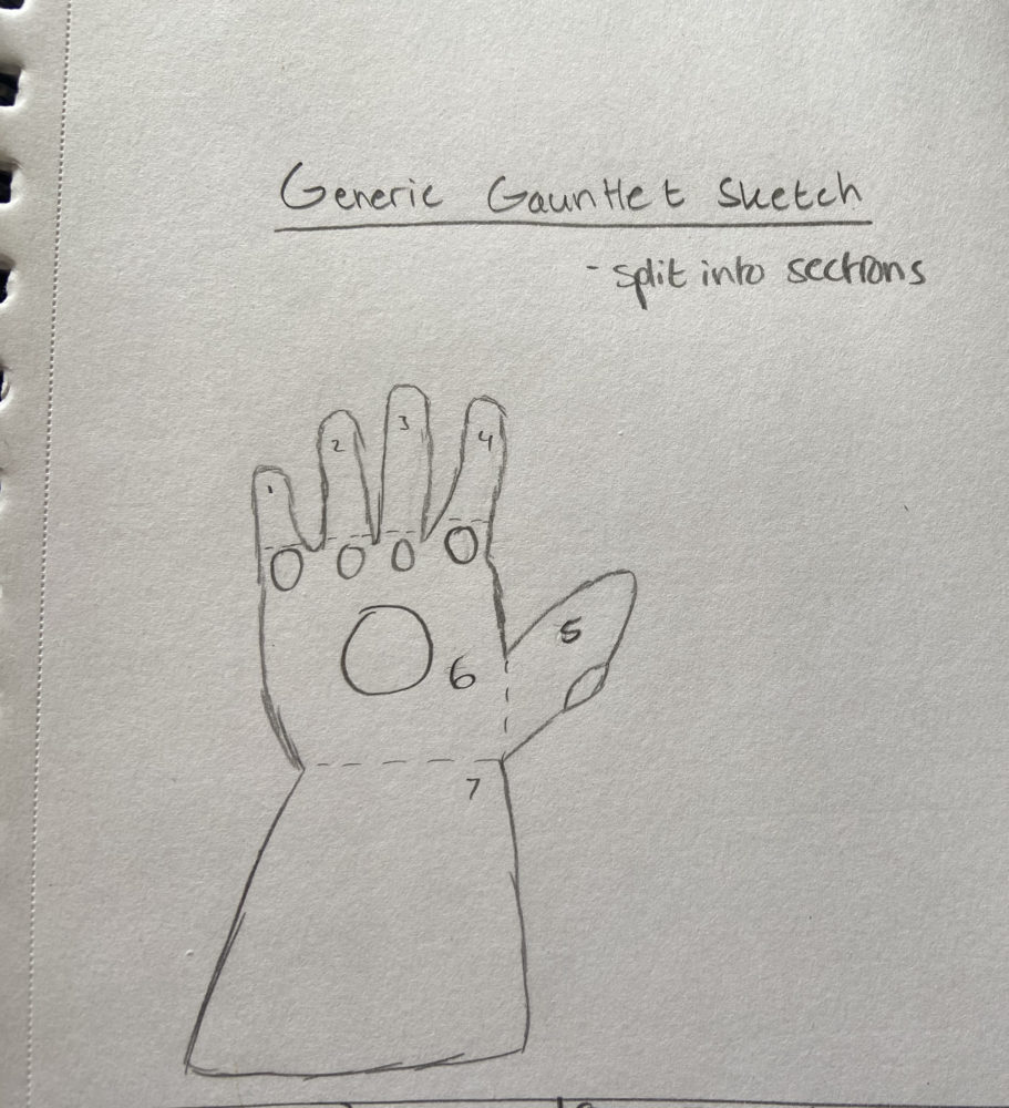 For adding the individual details to the design, I am thinking of using a pencil or pen to add “indents” to create the detail needed. Once each of the pieces have been assembled and designed, I am still thinking about a potential solution for putting each piece together. Once the gauntlet has been assembled, I will be using the same pencil or pen to create different holes where the jewels will be, and then line the interior of the gauntlet with the LED strip lights. For the battery pack itself, I am thinking of also embedding that into the interior more by the base (where my wrist would be. I have found some videos that will be giving me guidance in the assembly process. The sketches below signify the different sections I am anticipating on assembling.