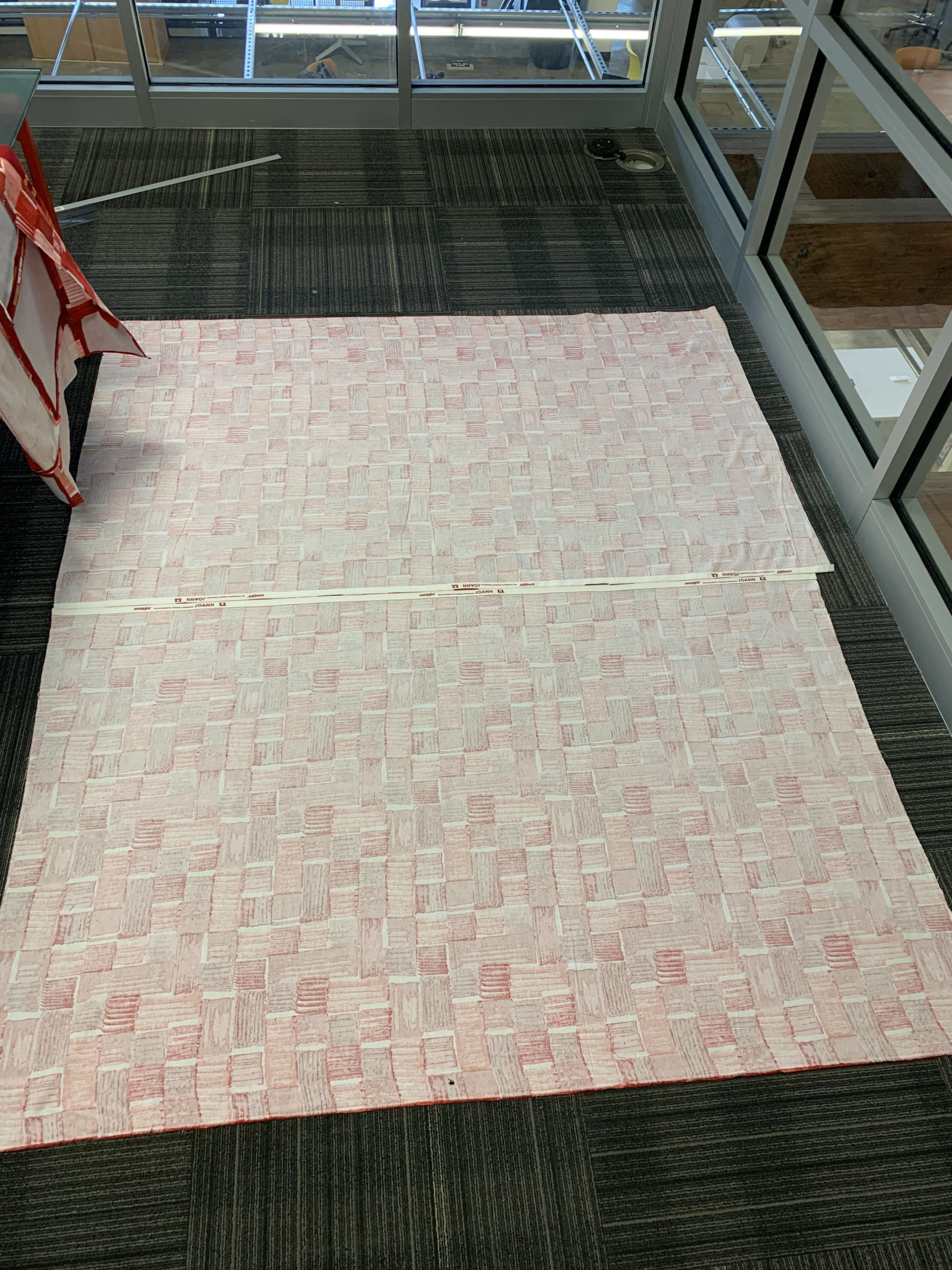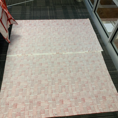First, I cut two large panels (because the stock size the fabric is sold in wasn’t large enough for one piece) of my back side fabric and sewed them together to the size of the front side, leaving about a 2″ border. I then laid this on the ground face down and placed my batting on top. Batting is a fluffy cotton fabric that adds weight/ thickness to the overall quilt. Lastly I placed my top side face up. I then placed several pins (like 50) all over the three layers so that they would stay in place. I sewed around the edge and along several seams in the midle of the quilt to make sure all three layers wouldn’t shift at all. I then cut the excess batting and back-side fabric and sewed the edges over to create the final border.