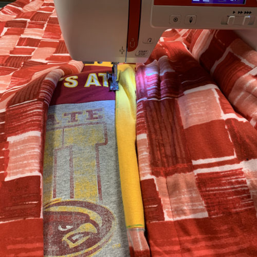 The next step is to sew all the front panels of fabric and t-shirt together. This is done by laying the front sides together and sewing along the edge that you want to be connected. Leave 1/2″ for seam allowance.