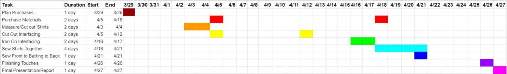 I began planning this project back in the summer of 2018, when my sister graduated from college. Below is the t-shirt layout I created at that time and the dimensions of each panel on the front side that I used for the initial planning on the project.