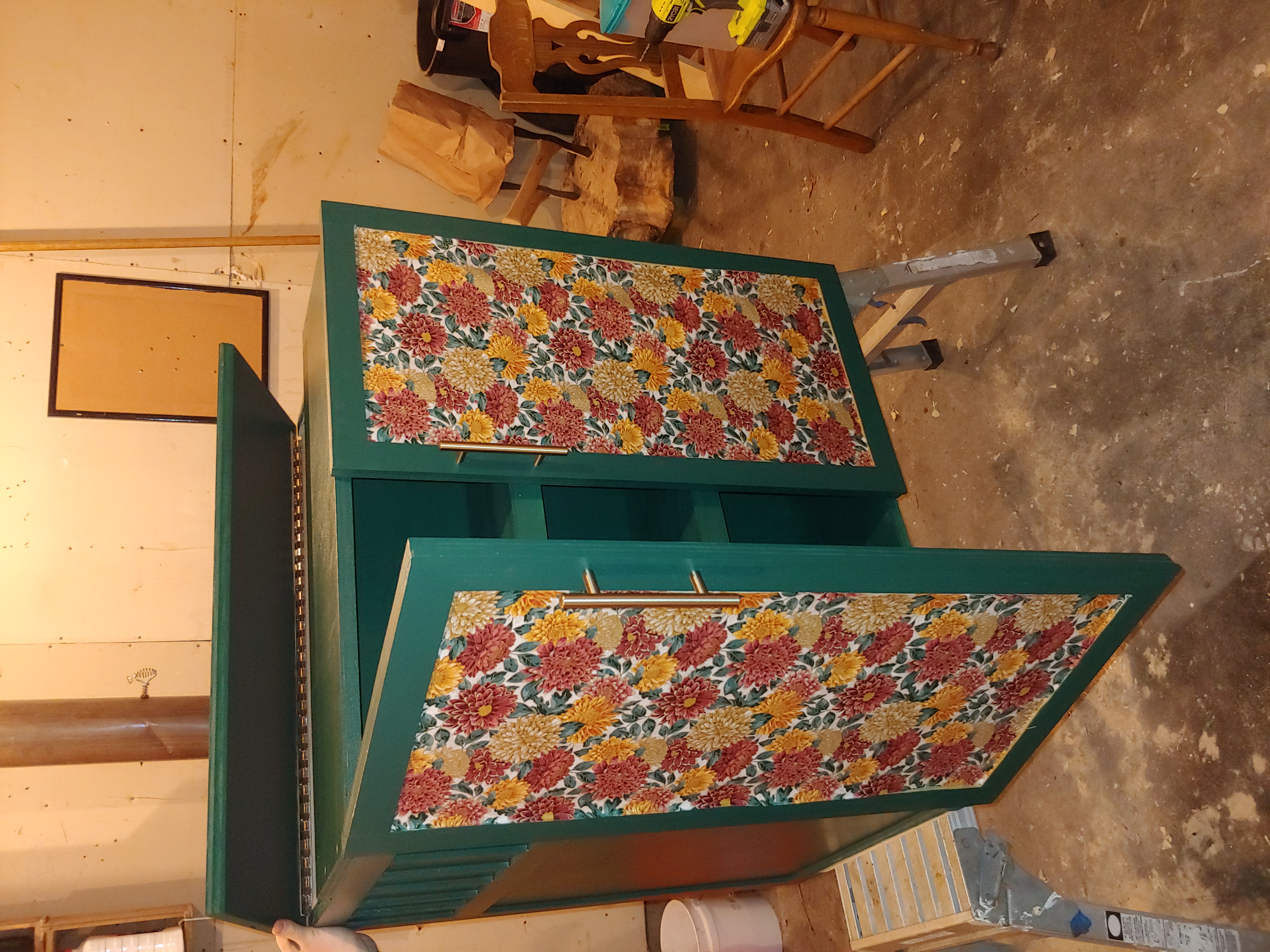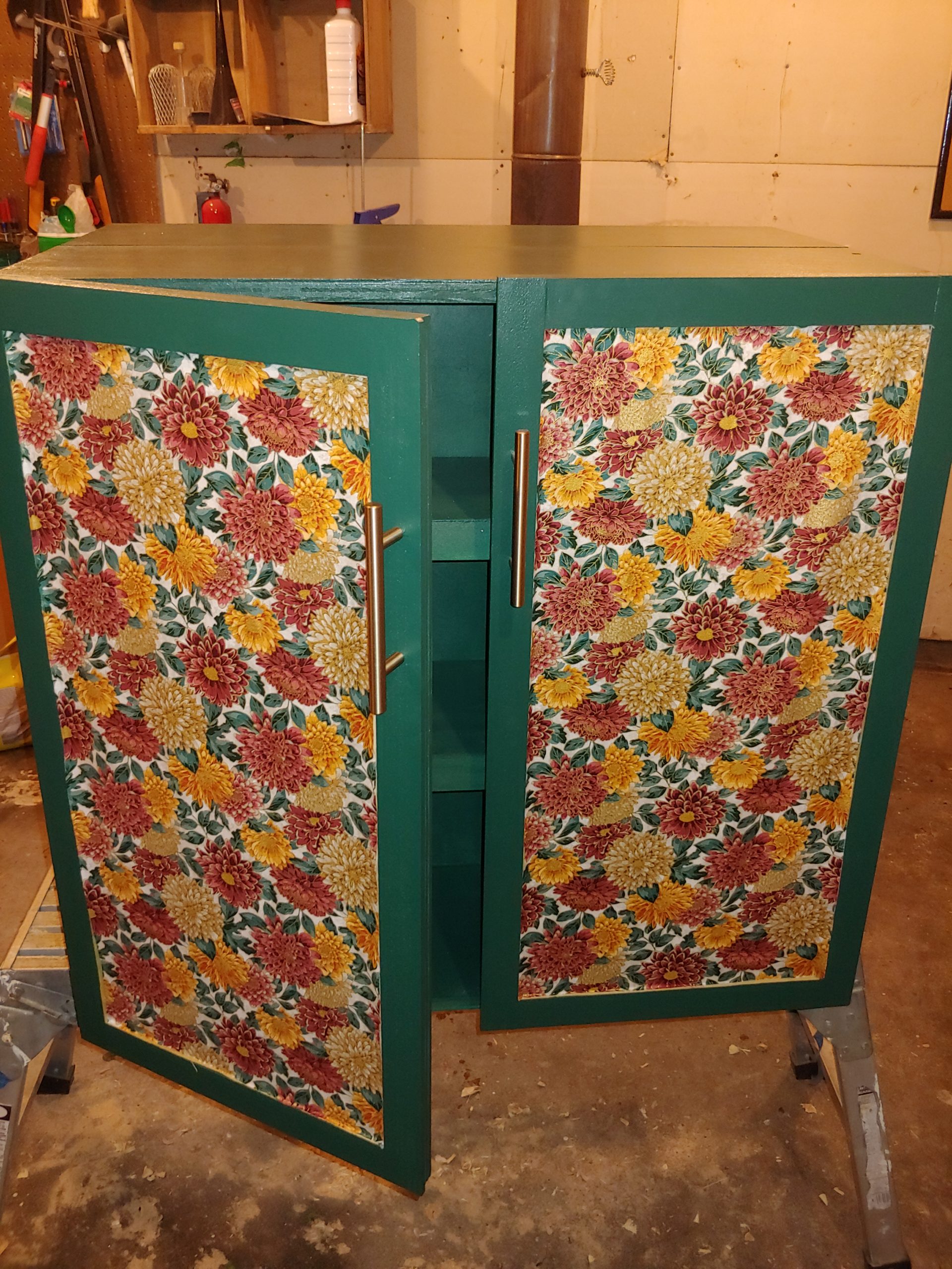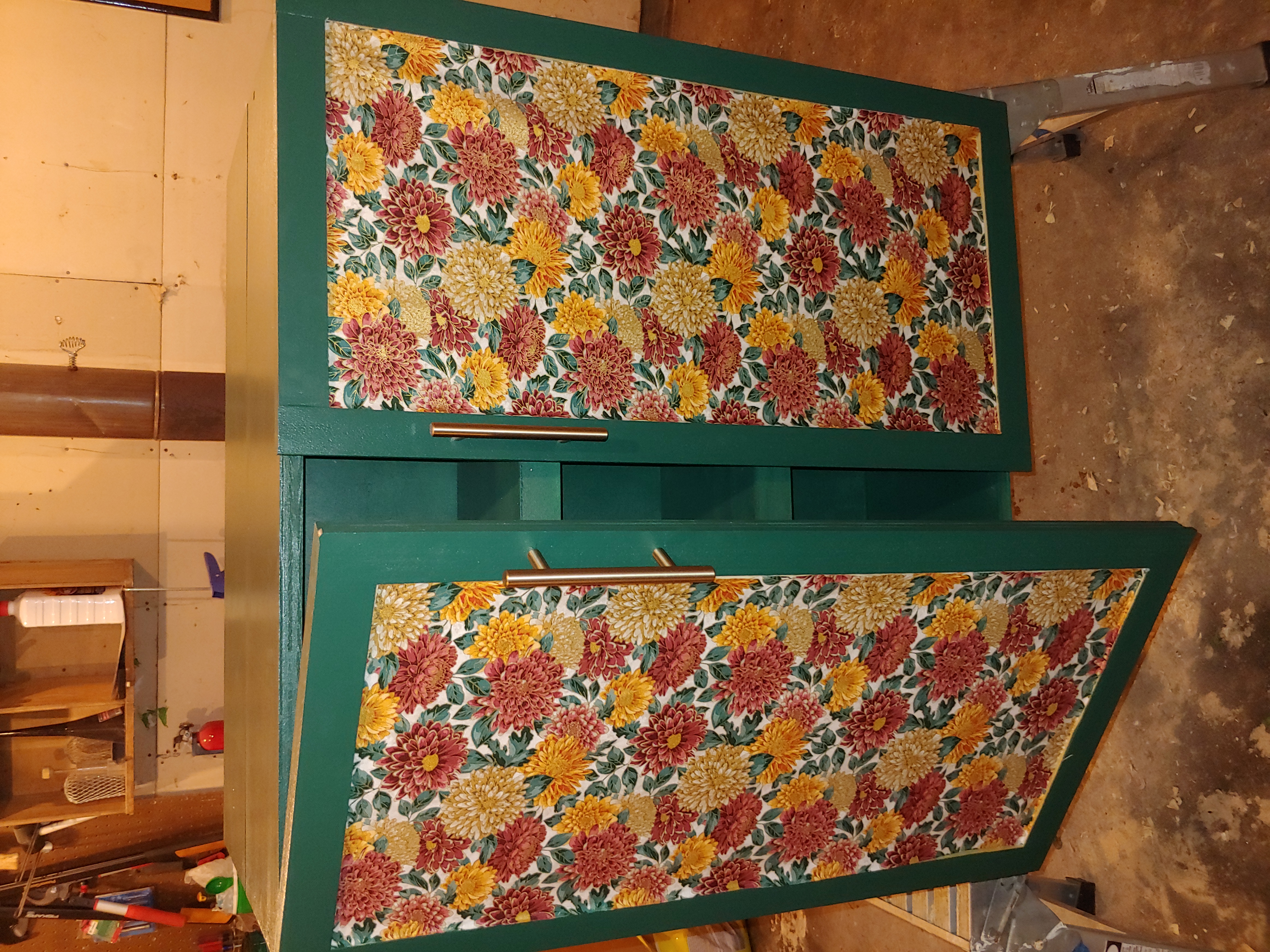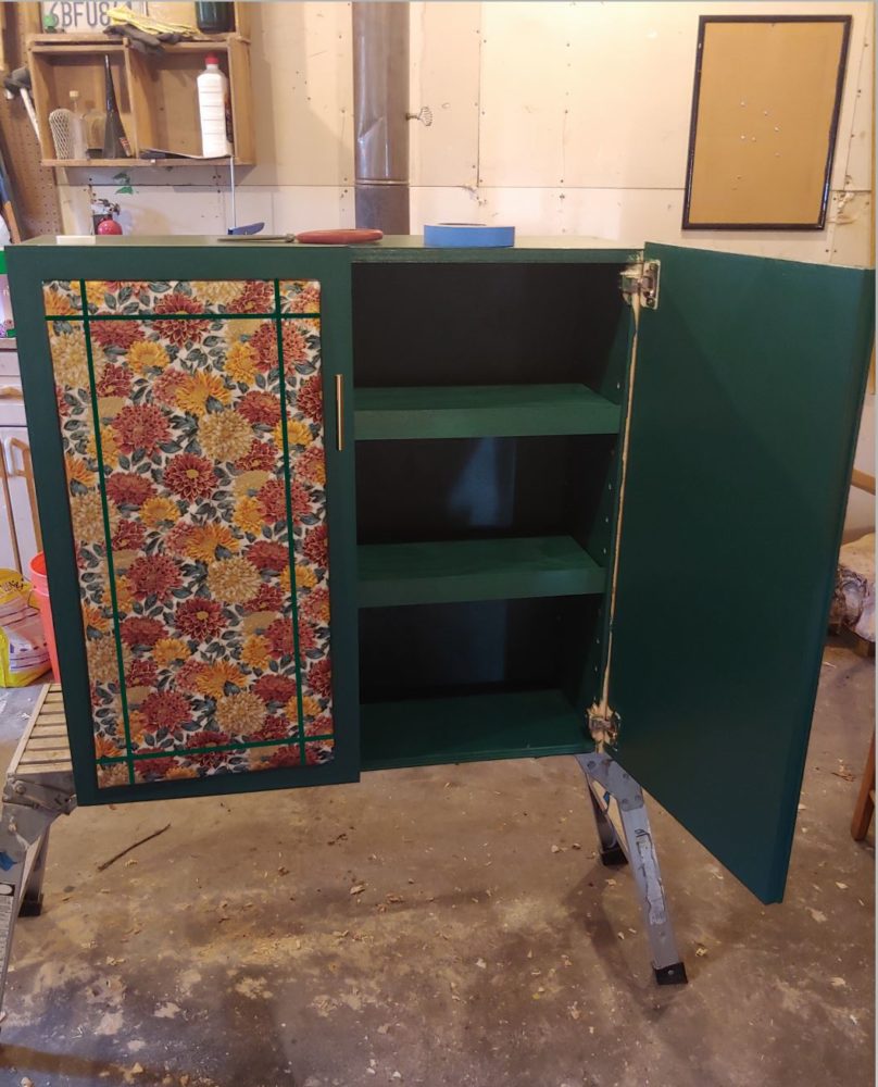 After fully constructing the cabinet, the next step was to add the finishing touches. This included deciding what final method I wanted to use to cover the plywood including painting, staining, contact paper, and etc. In the end once walking through various stores I decided to use fabric to cover the door panels and paint to finish it off. I ended up choosing a multicolored fabric with flower print, some of the reason behind this might have been because I have been in a planting mood recently from trying to get my garden together. I also just enjoyed the color of the print with that vary autumn feel. I then chose the paint color from the print and decided to go with a dark green because that is one of my favorite colors at the moment.