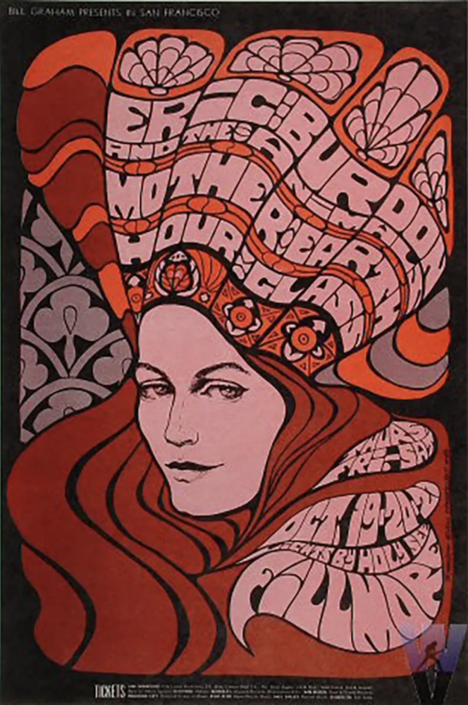 Other notable artists of the era include Bonnie Maclean, Victor Moscoso, Alton Kelly, Rick Griffin, and Stanley Mouse. The famous Fillmore Auditorium and its owner Bill Graham helped to enable the popularization of the psychedelic style by contracting these artists to make their concert posters from 1965 through 1970. The style was meant to grab and hold people’s attention, and with the distorted form of the letters sometimes almost illegible, people were entranced.