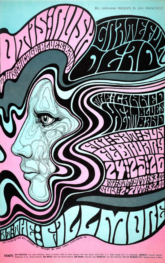 The style was defined by bright complimentary colors, flowing patterns, and most notably, the wonky, fluid like lettering that blended the art and the message together, The posters were mass produced by offset lithographic company Tea Lautrec based in San Francisco. And while the popularity of the style drove it too spread to other popular music scenes, nowhere else compared to the sheer quantity of the art produced in San Francisco.