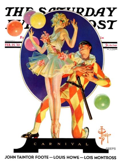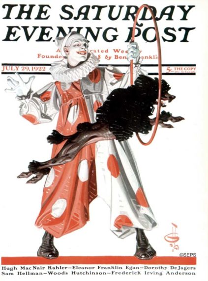 J.C. Leyendecker has several examples of clowns that he was drawn, specifically for the Saturday Evening Post Covers, including “Circus Dog” and “Carnival.”