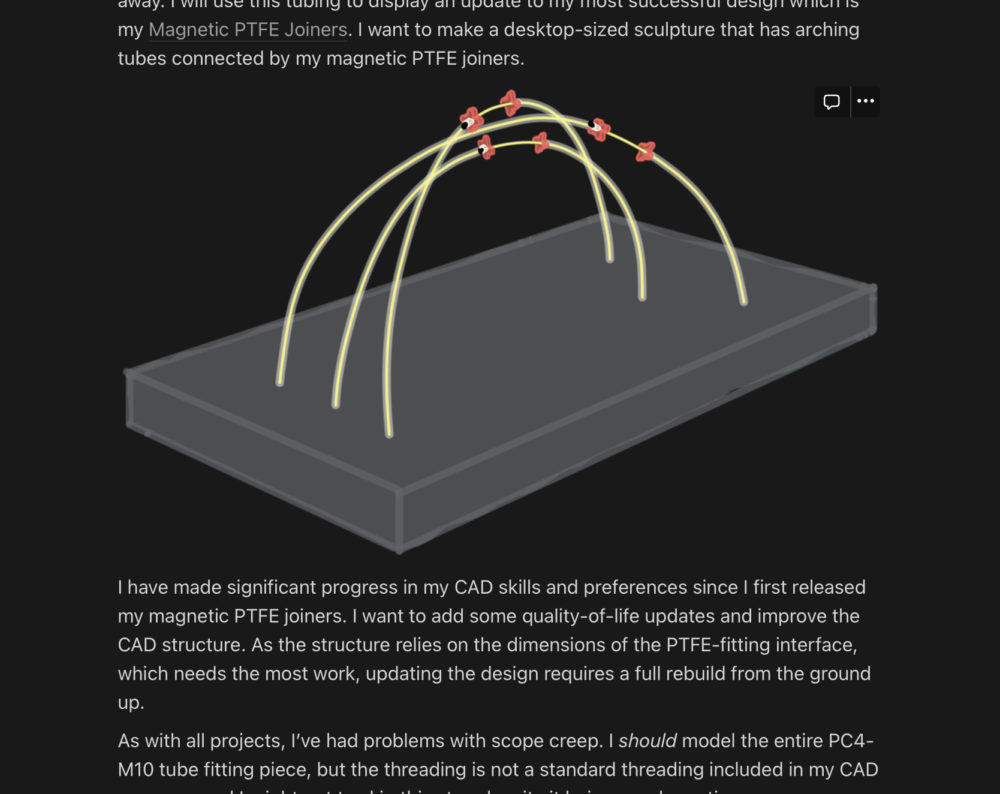 My project is about re-using the spare PTFE tubing that would otherwise be thrown away. I will use this tubing to display an update to my most successful design which is my Magnetic PTFE Joiners. I want to make a desktop-sized sculpture that has arching tubes connected by my magnetic PTFE joiners.