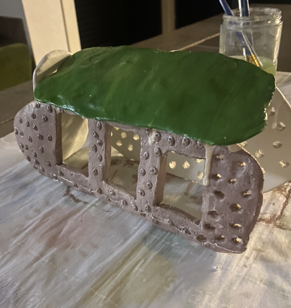 To create a model of an Earthship home, I focused on the use of clay for the structure. Although the additional materials I used would not be part of an actual Earthship home, they serve as a representation of the upcycled materials that are often used in the construction. To represent the large windows and solar panels, I used pieces of a plastic fruit container. The metal bottle cap and tab and the plastic beads represent the use of glass and plastic recycled materials.