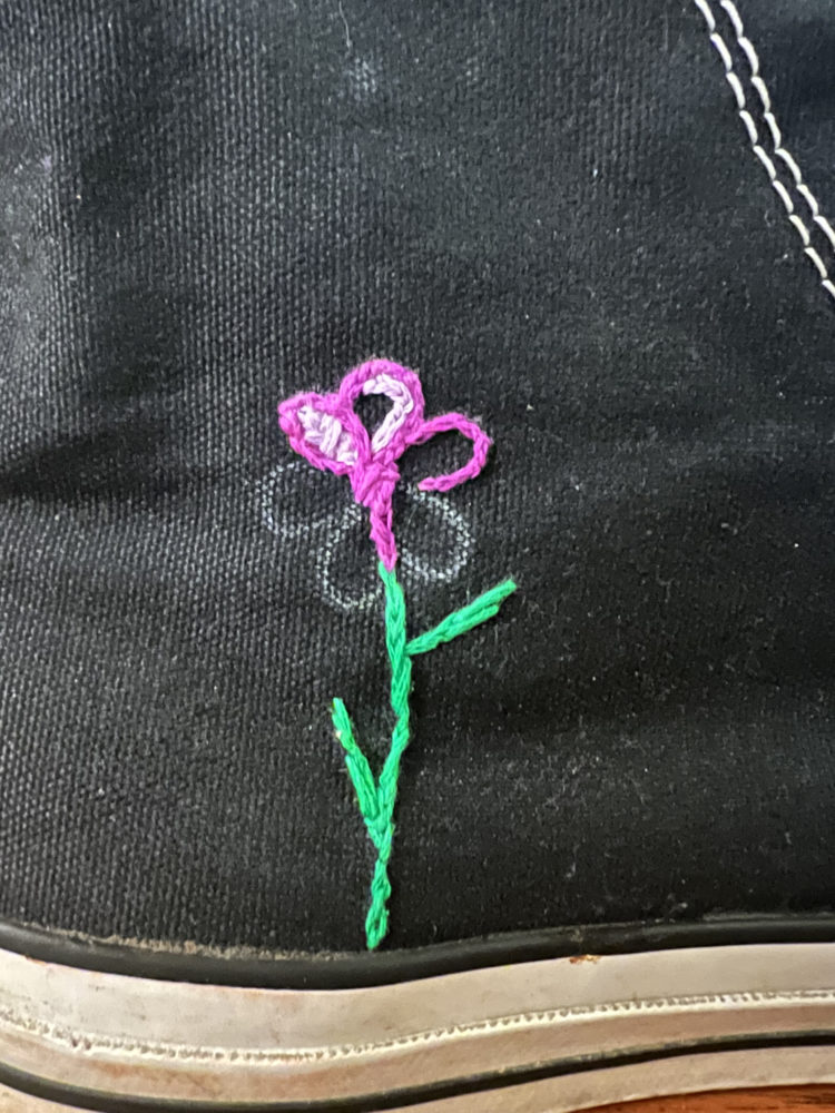This is a great way to upcycle an old pair of shoes. The embroidered flower design definitely compliments the aesthetic of the Converse. I have also never embroidered before, but always admired custom embroidered shoes. I would love to hear more about the learning and labor processes that you undertook during this project.