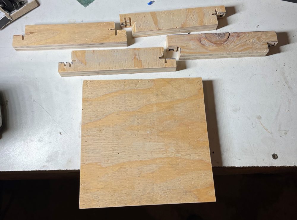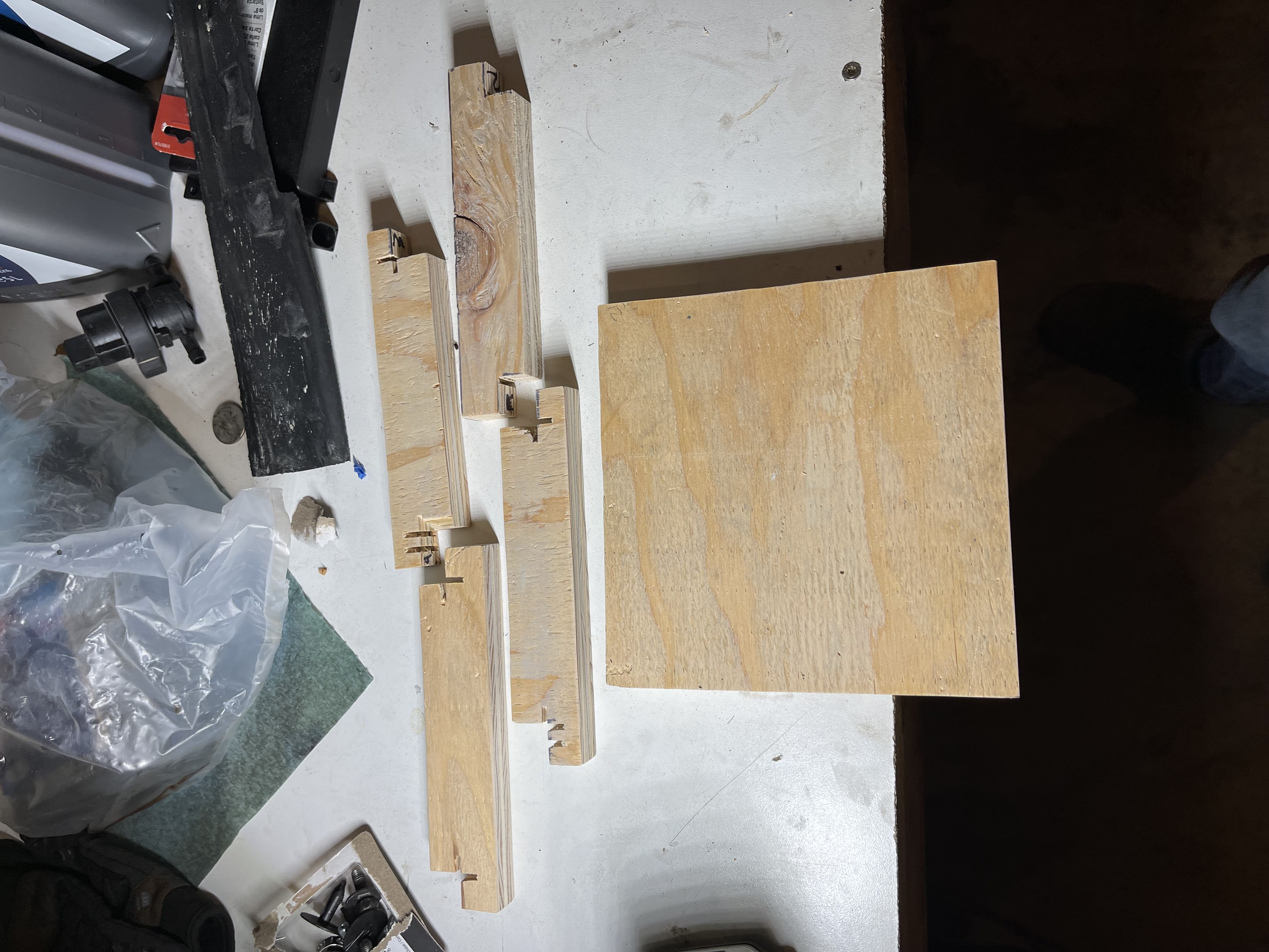 I cut the base sections out of a sheet of 1″ plywood that my roommate had also gotten for an unrelated project and no longer had a use for. I drew some rudimentary dimensions in a notebook and cut the pieces to size. I secured them together with a screw in each corner through the base. ![]()