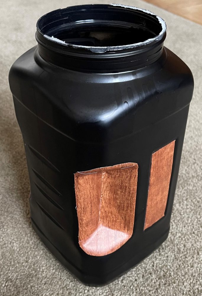 I also inlaid several pieces of wood texture “repair tape” to add more wood grain into the rest of the project without having to invest in learning advanced woodworking techniques to complete the project. The tape also aided in adding depth to the project by utlizing the shape of the original container and contrasting the satin black paint.
