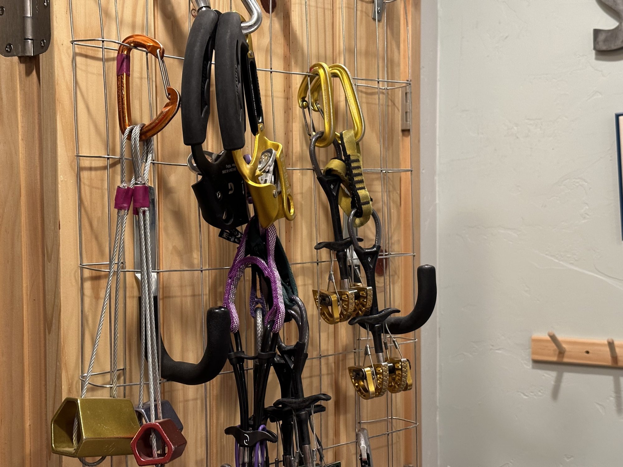 I think in the long run, the wire fencing may bend some with wear and tear. We’ll see. I’d still like to investigate using a thicker gauge, or chain link, but with maybe 50 pounds of gear on the rack, it still seemed to hold up okay! Very fun to use a non traditional material for this, and put something to use from elsewhere as opposed to just buying something off Amazon. I also think it would be cool to incorporate some old climbing gear into the rack somehow. Maybe old bolt hangers, or something?