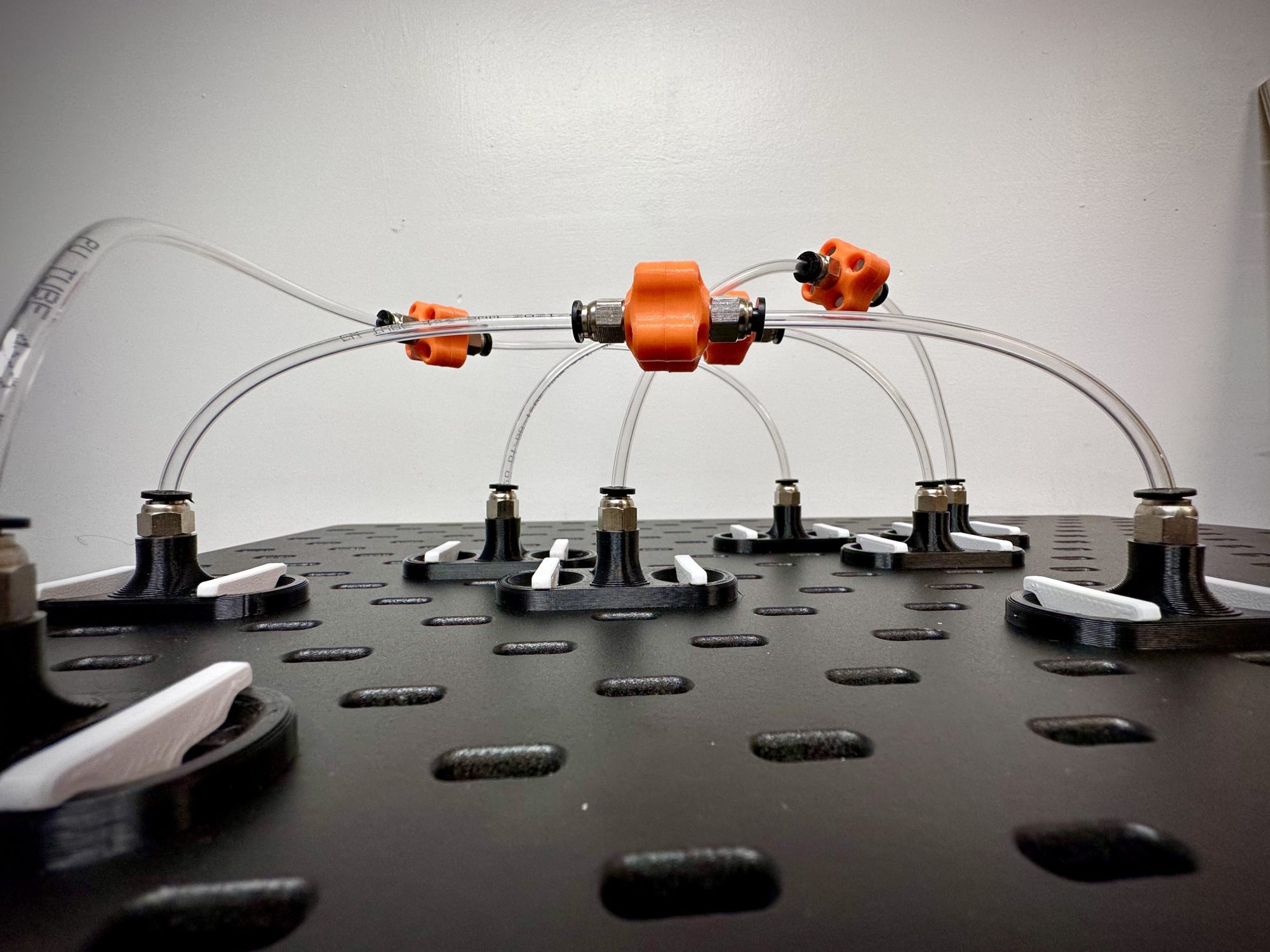 My final product is an arching interactive sculpture piece consisting of my PTFE Joiners, tubing, all fastened together using Skadis.