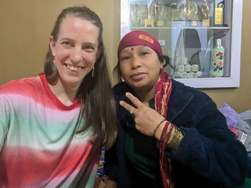 A unique pair of socks made by Kamlesh, resident and artisan from the city of Manali, and photo of us after having a breakfast of siddu made in her home.