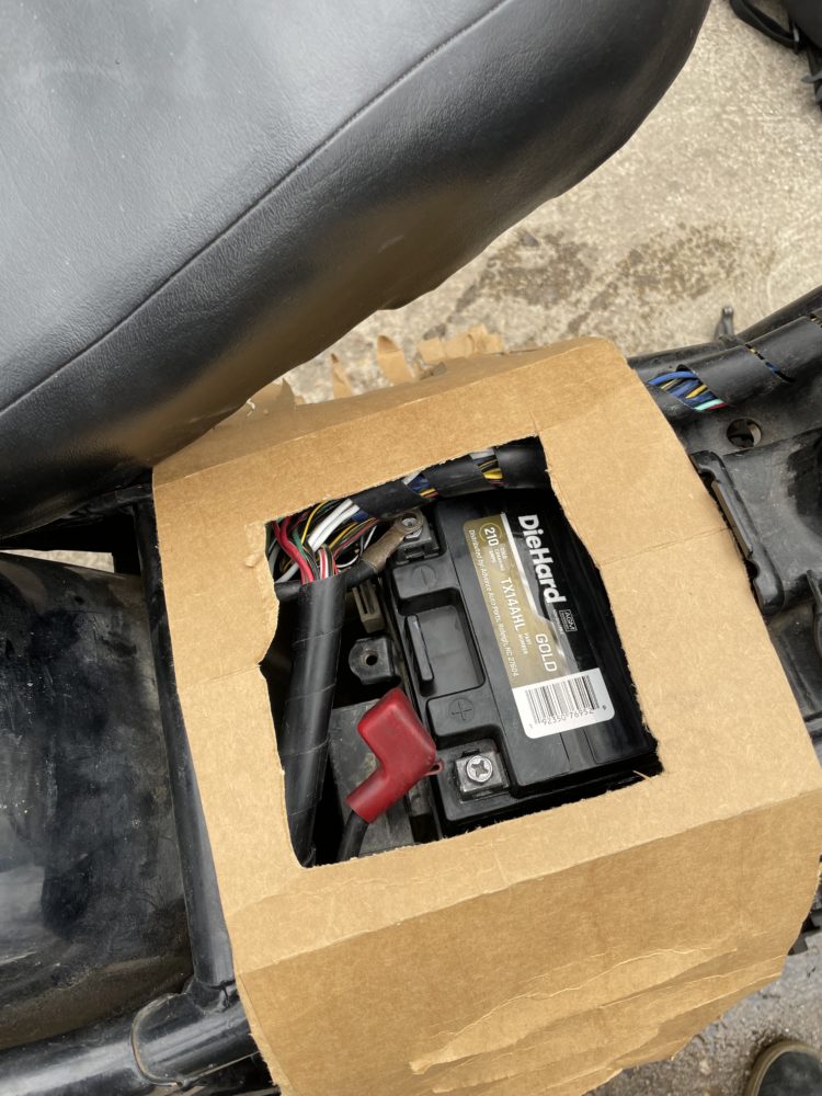 Echoing what Rachel commented, I would be careful using leather fringe directly in contact with the engine or exhaust. Taking inspiration from a previous project where they made a bike fender from an aluminum can, do you think you could similarly make your battery cover and add decorative leather on the exterior. The cardboard mockup looks great in both styles and I’m excited to see what you end up creating!