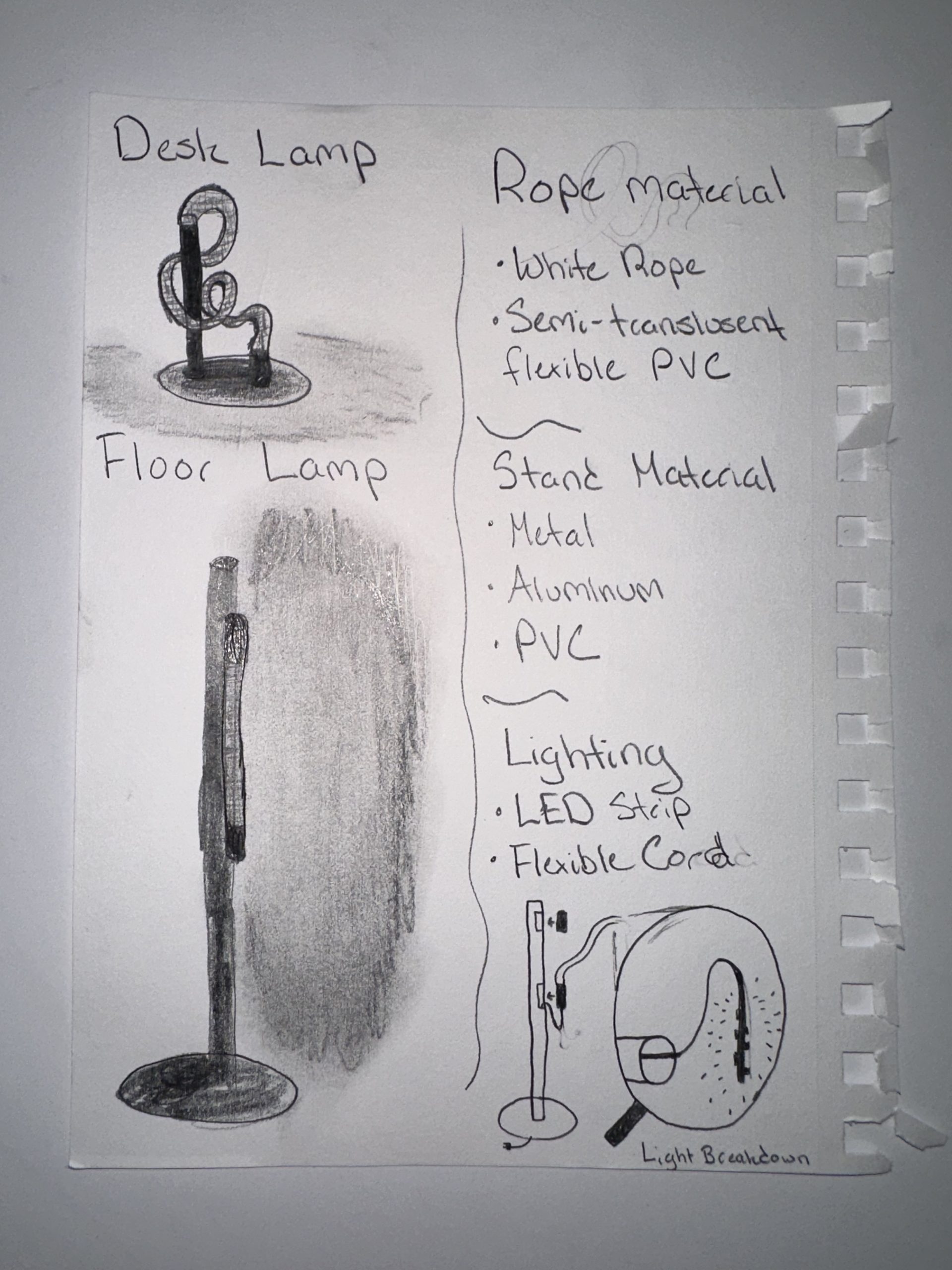 At this point, I started sketching and designing different variations of flexible lamps that I could make. While there was a floor lamp as well as a desk lamp in my original sketch, I really wanted to move forward with the floor lamp solution. This design would essentially require me to connect some sort of pole for the structure to a base plate. Ideally, these would be polished/sleek metal material. After the main structure of the fixture is assembled, I would then take an acquired diffused LED strip and wrap it in some kind of mesh material to give it a rope-like appearance. This flexible light strip would then be inserted on one end into the top of the metal tube while the other end would be free and thus could be moved around and changed depending on what the user wants.
