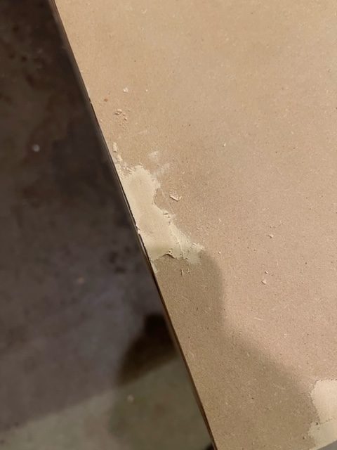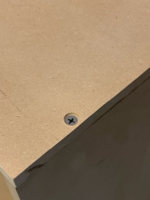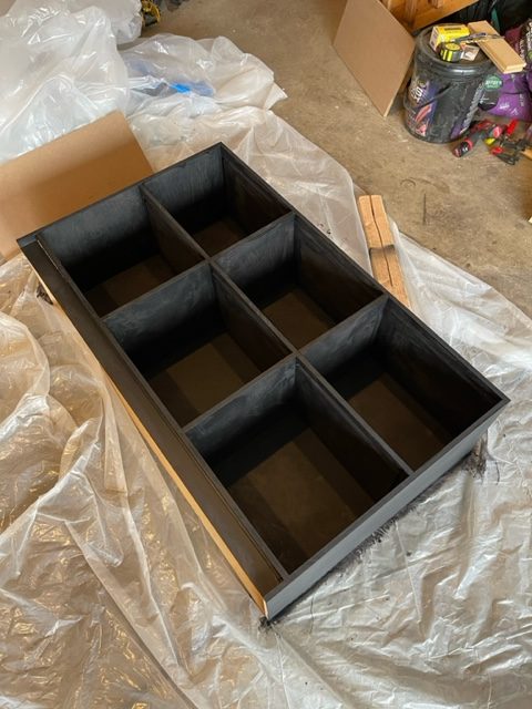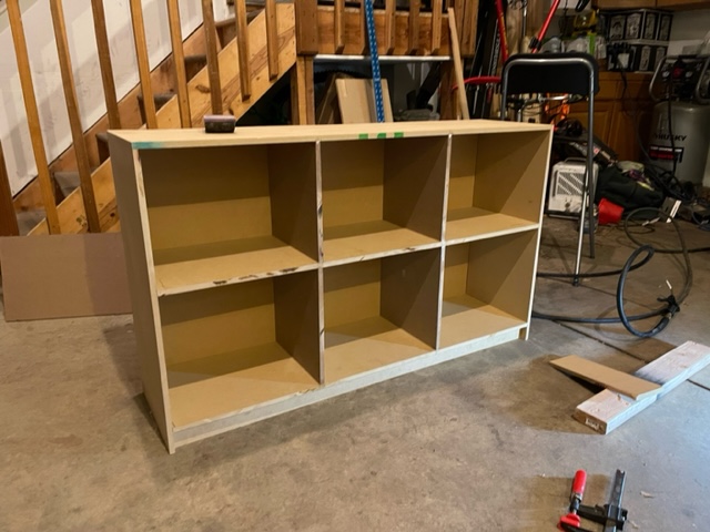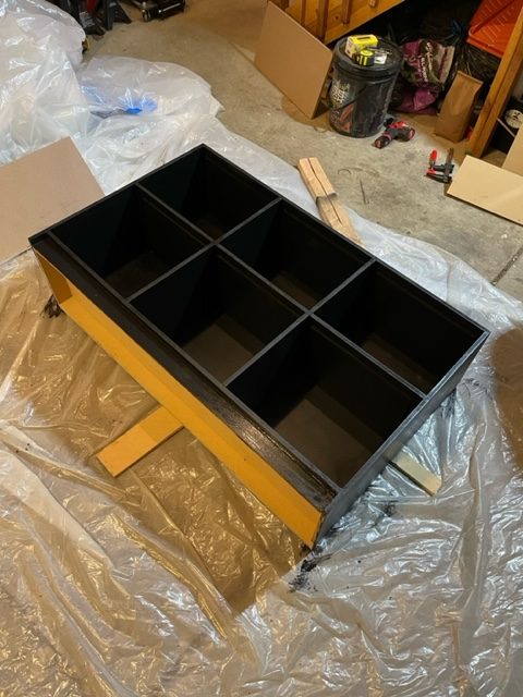The next day, I prepped for paint by sanding the wood filler down smooth and managing any slightly misaligned edges. I also gave all corners a quick brush with the sandpaper just to remove any excessively sharp edges. I liberally applied high-pressure air to the entire shelf to make sure I had removed all particulates from the surface before painting. I laid the shelf on its back to give me easier access to the deepest parts of the shelf without covering my arms in paint. I applied two coats of paint on the accessible and necessary sides (not the back, yet) and allowed it to dry enough to stand it up, and applied two coats to the back of the shelf. I allowed it to dry overnight while propped up on some scrap wood to make sure no wet paint remained underneath the shelf or stuck to the tarp (potentially causing chipping when moved).