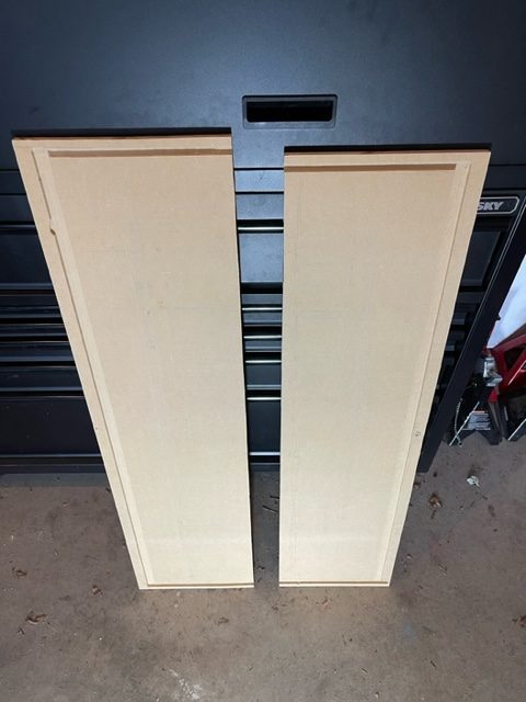 Later that week, I copied some notes down to my notebook about how I planned to cut the sections out of the sheets of MDF and cut all of the parts out. I time-lapsed this process. I verified that all of the parts that I had cut were correctly sized and shaped by roughly assembling the shelf, being held together with two scrap boards on the sides and the banister of my garage stairs to hold the back upright. This verified that nothing needed to be recut, which I was thrilled about, especially after having to recut several pieces for my upcycle project.
