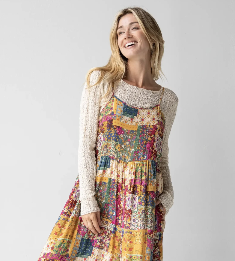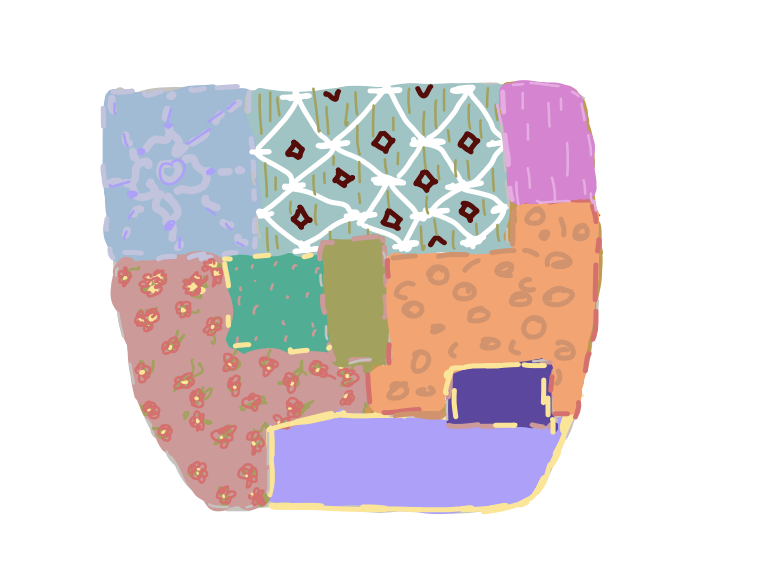 The aesthetic I will emulate in my upcycling project is cottagecore. Elements of this aesthetic already encompass the way that I fill my space, so I plan on creating a static piece of hanging furniture that serves as decor for my apartment. The piece will be a three-tiered combination of a wooden shelf storage display, a hanging plant holder, and a visual art statement. Cottagecore is all about blending earthy, bright, and floral elements into a mosaic that resembles the flow of nature, and this three-tiered decor will do so. I plan on using old fabric from my clothing and friends’ clothing to sew together a patchwork fabric hanging pot. The following image of clothing made by Natural Life (1) displays the patchwork style.