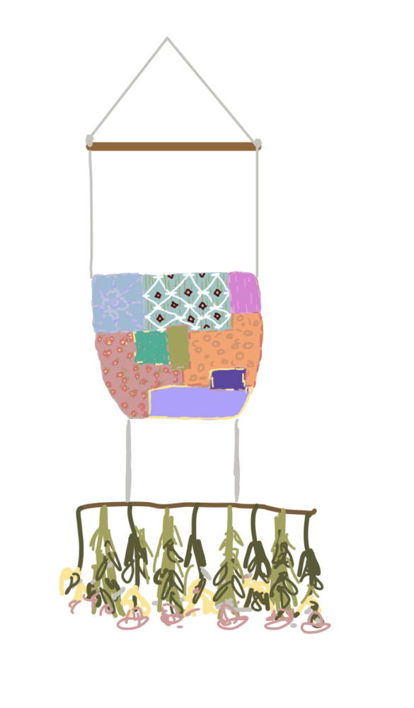 The final tier of this piece will be an artistic statement that emulates cottagecore. I have ziplock bags full of dried flowers and plant leaves, so I plan to weave and glue these together with strips of my upcycled fabric. Sticks that I find outdoors will cross in an X formation, and, using old string that I own, I will tie the strands of weaved flowers and fabric to the sticks. The following image from LuminousLivingLLC (3) is my inspiration for this artistic element of the project: