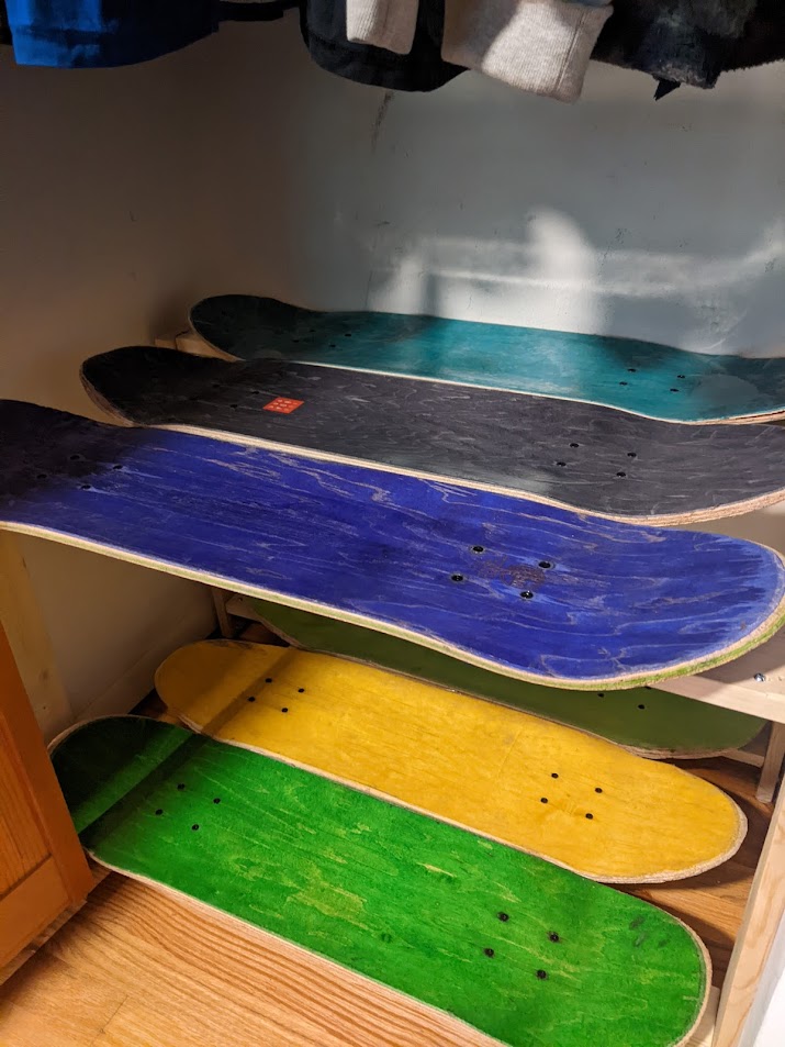I have had most of these for a few years, the decks wear out over time and need to be replaced, so I have accumulated a lot of these. I have been skateboarding for around 5 years, and I have also done a similar project with old decks. This is a pants rack I made from 6 old decks and several 1 X 4 planks:
