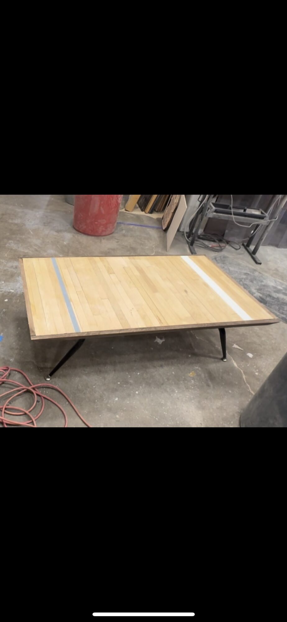 My Upcycle project is a coffee table made from an old basketball court floor, old elementary school chair legs, and a few other pieces of scrap wood and metal. I’ve managed to make significant progress on the build an am happy to say I’m almost done! Here is an image of what the table is looking like as of today.
