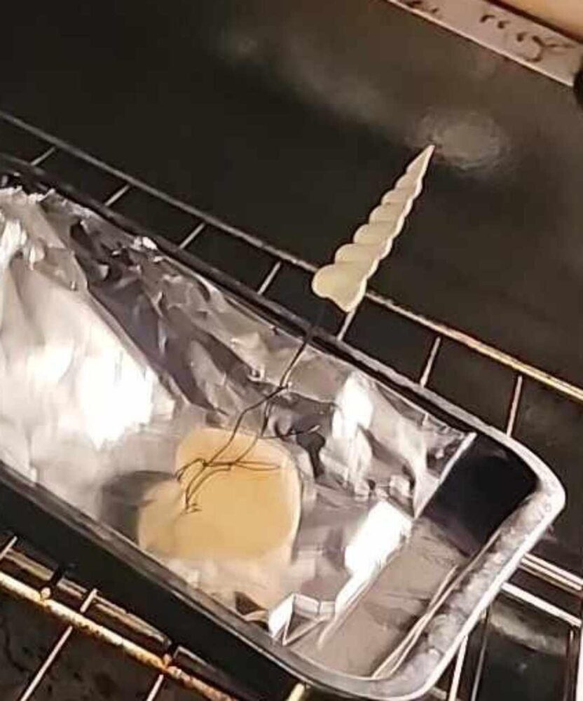 Getting charged up with oven unicorn magic. Baked at 250 degrees Fahrenheit for 15 minutes. The temp and time are decided on vibes.