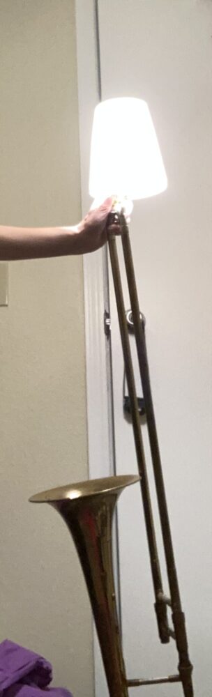 Current state of trombone lamp! Needs a lamp shade and a base.
