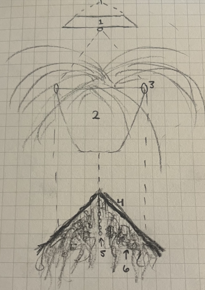 For my upcycling project itself, I am making a decorative piece that will hang from my apartment’s ceiling. It will be a three-tiered combination of a wooden shelf storage display, a hanging plant-holder adorned in patchwork fabric, and a floral art piece entitled “Floating Bits of Life.” The following image is my overall vision for the project.