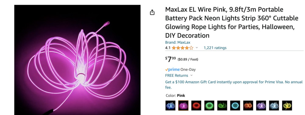 Amazon Prime. MaxLax EL Wire Pink, 9.8ft/3m Portable Battery Pack Neon Lights Strip 360° Cuttable Glowing Rope Lights for Parties, Halloween, DIY Decoration. 2024. https://www.amazon.com/MaxLax-Reduction-Electroluminescent-Halloween-Decoration/dp/B08FCBY9JR/ref=asc_df_B08FCBY9JR/?tag=hyprod-20&linkCode=df0&hvadid=459539772142&hvpos=&hvnetw